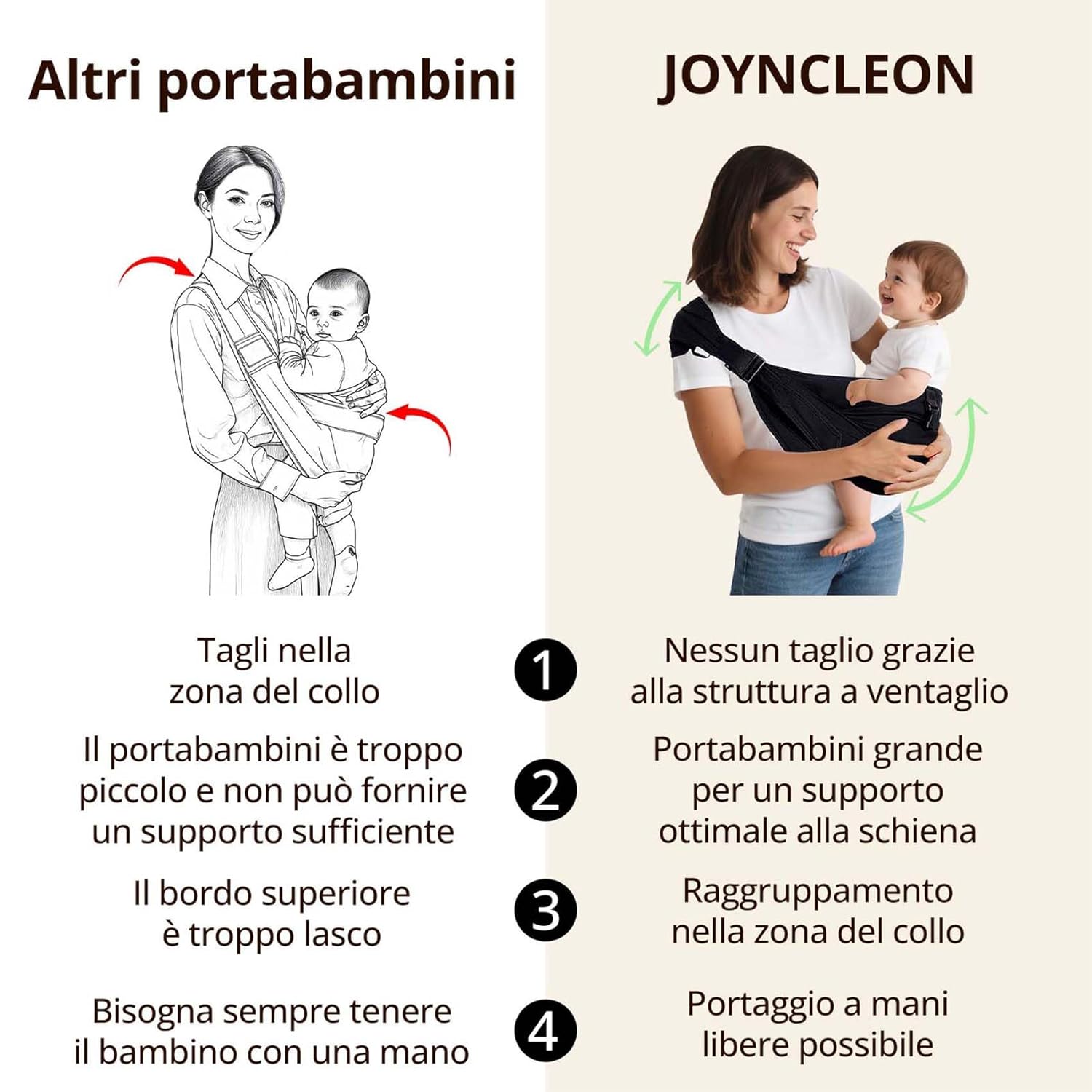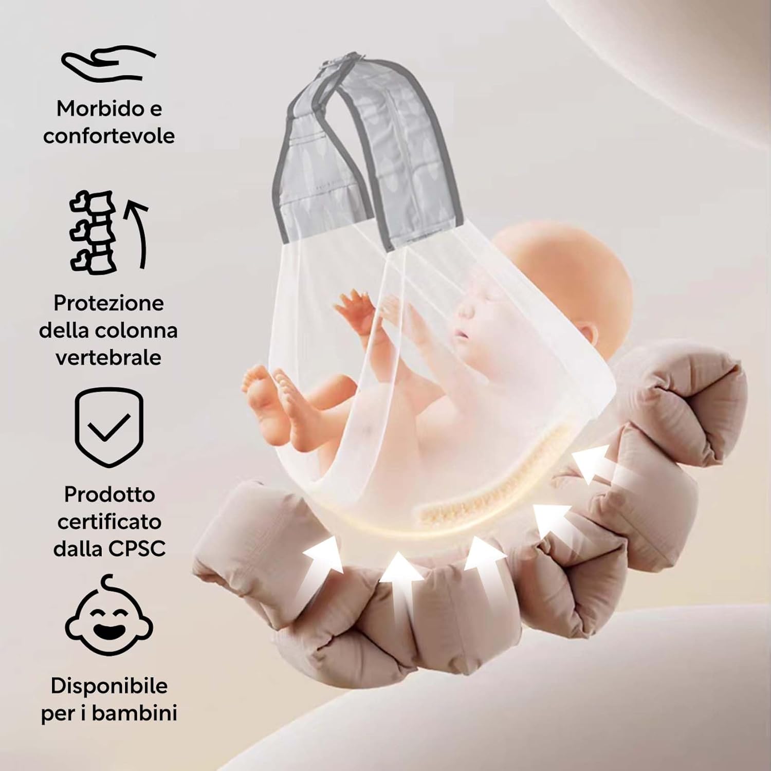 • Укрепване на връзката родител-дете: Успокояващата близост и безопасността имитира сигурността на утробата - намалява безпокойството и насърчава спокойния сън. Носенето със свободни ръце позволява повече взаимодействие и практична мобилност в ежедневието.