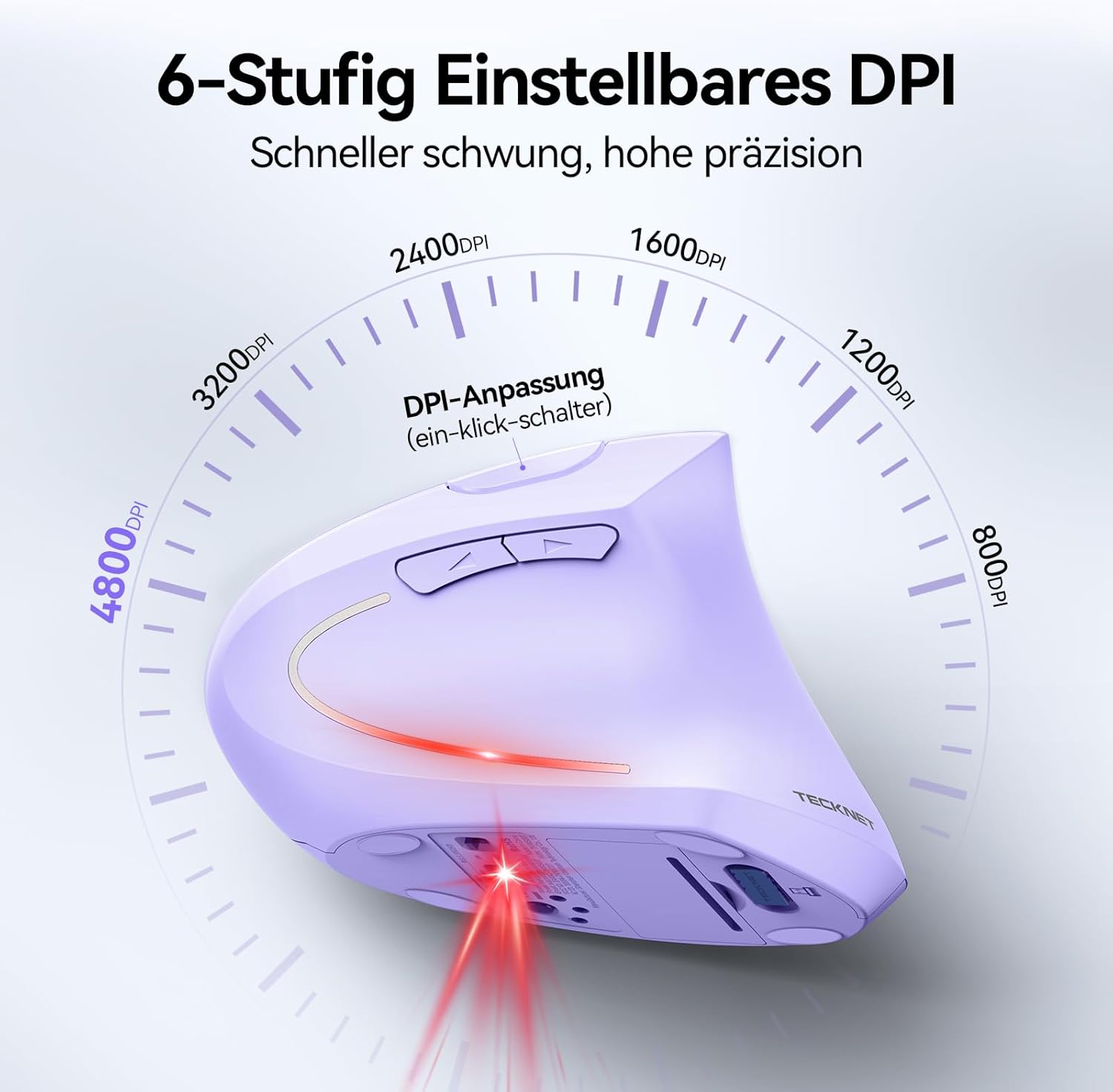• По-висока DPI и 6 регулируеми нива: Тази ергономична вертикална мишка е оборудвана с високопроизводителен чип и има 6 регулируеми DPI нива (4800/3200/2400/1600/1200/800), за да отговори на вашите ежедневни нужди. Подобрената технология за безжична мишка гарантира, че тази ергономична мишка работи гладко върху различни повърхности. Когато промените настройката на DPI, светлината мига, като броят на миганията съответства на настройката на DPI.