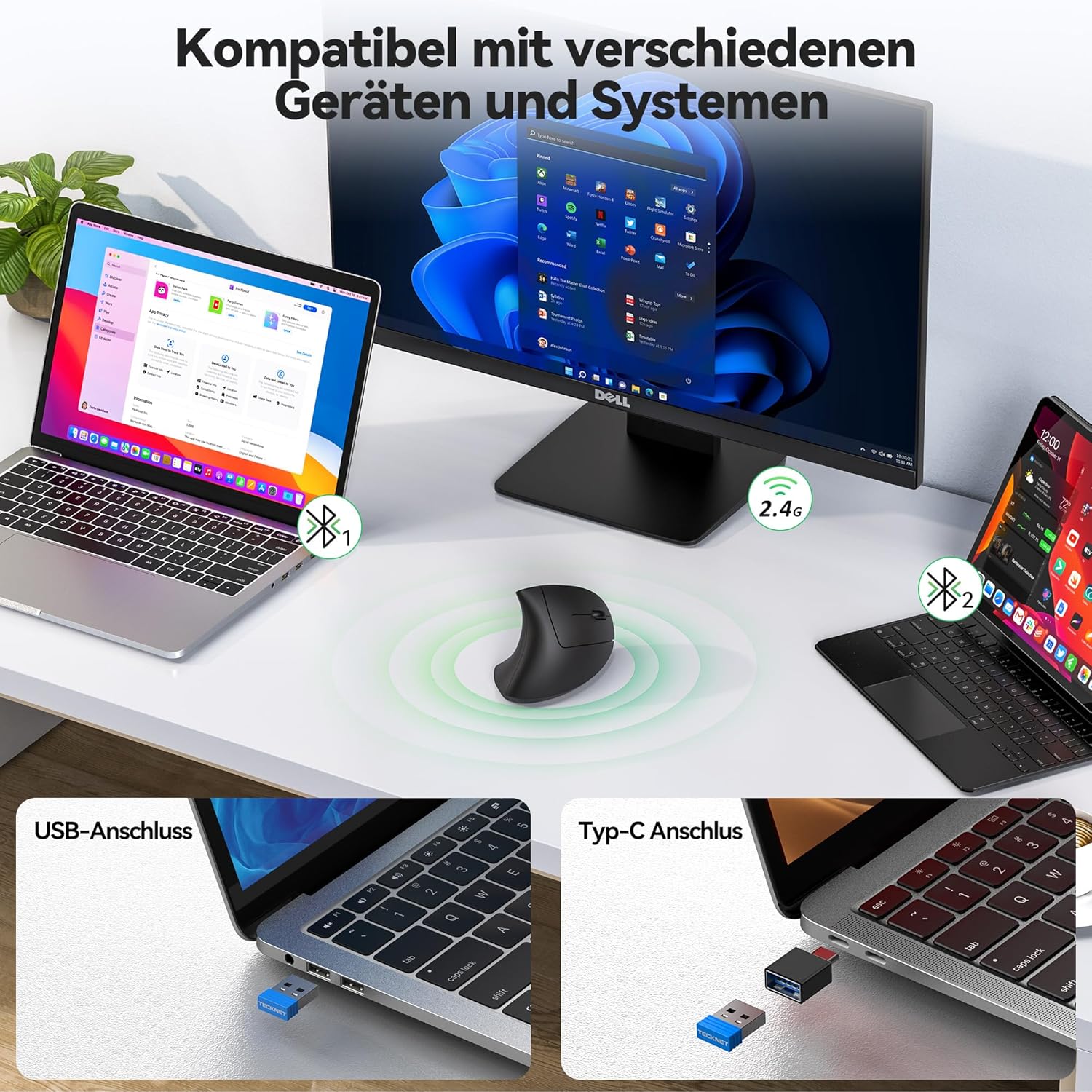 Ергономична мишка TECKNET с Jiggler, безжична Bluetooth вертикална мишка (BT 5.0/3.0 и 2.4G) с USB-C адаптери, 4800 DPI оптична тиха мишка за лаптоп/PC/Mac/таблет/iPad (Win/Android/iOS) 6 бутона
