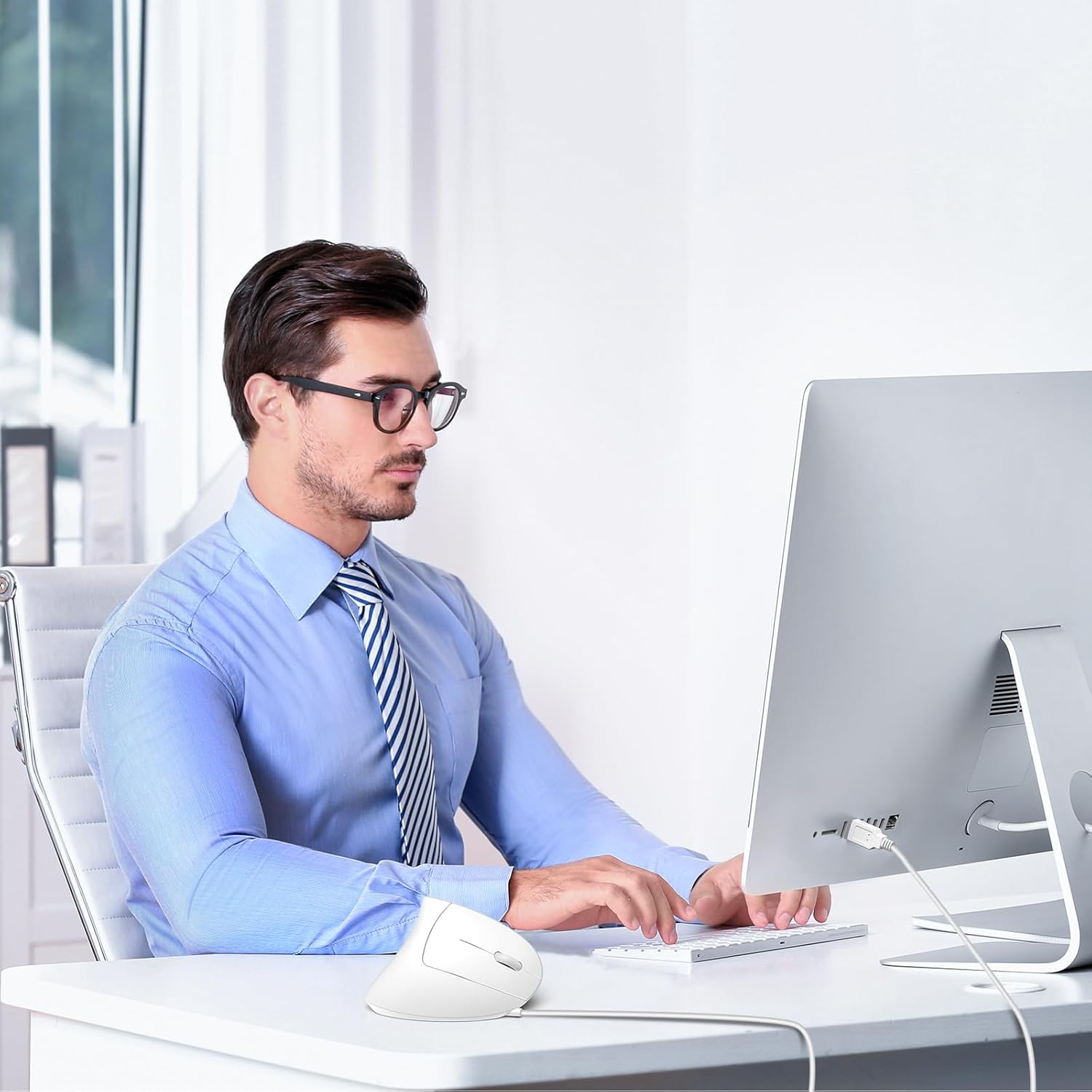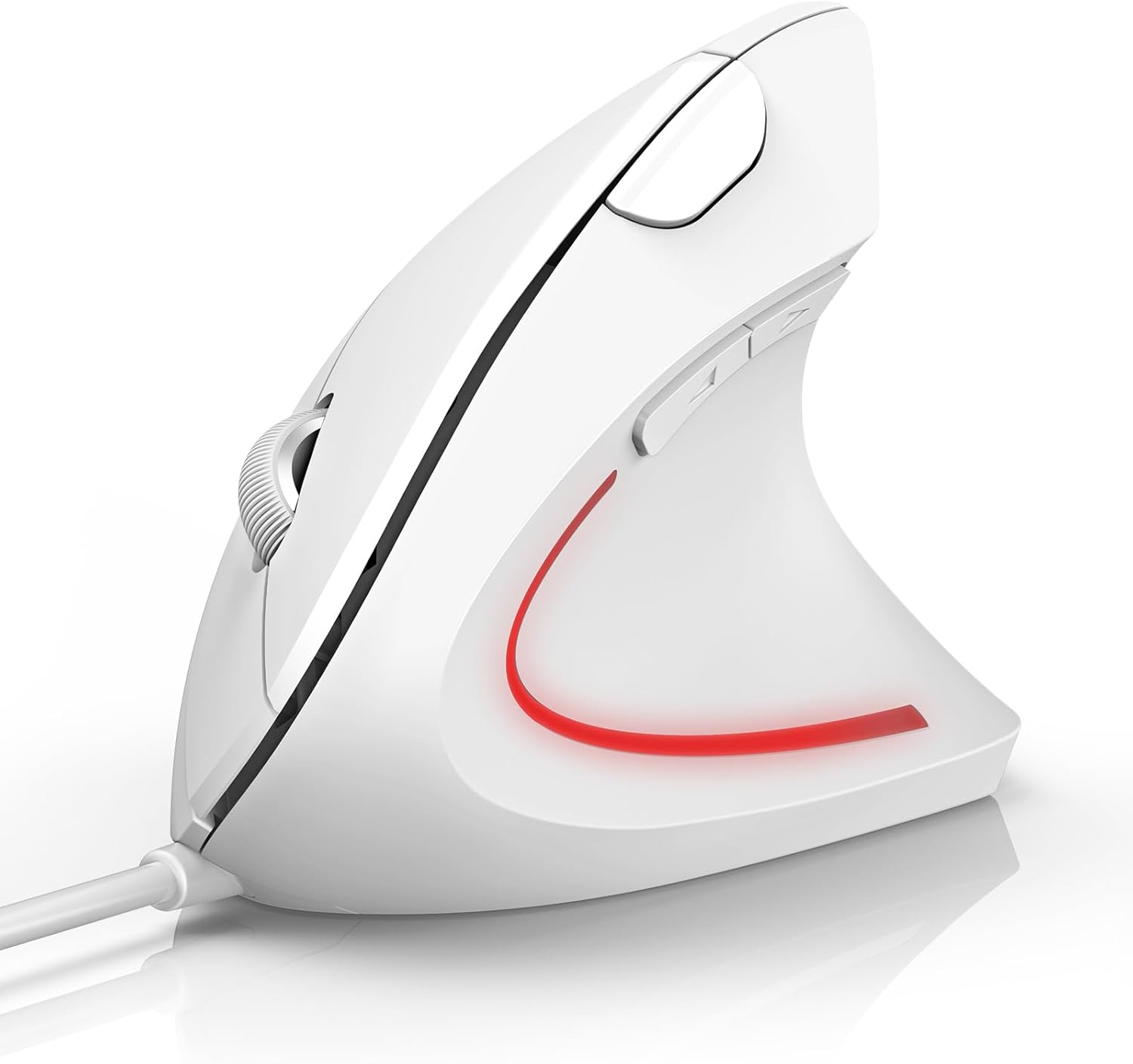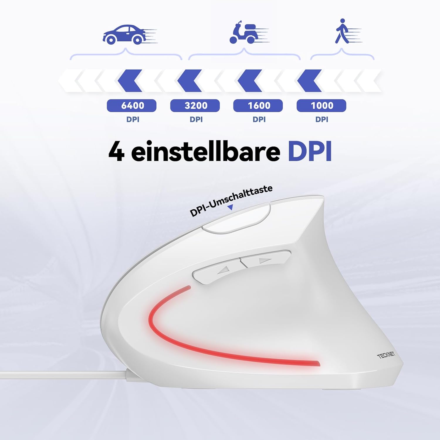 Ергономична вертикална оптична мишка TECKNET, защита срещу изкривяване на ръката/тенис лакътя, 6400 DPI 6 бутона, LED осветление, компютърна мишка с USB кабел за десничари, Windows и Mac OS - бяла