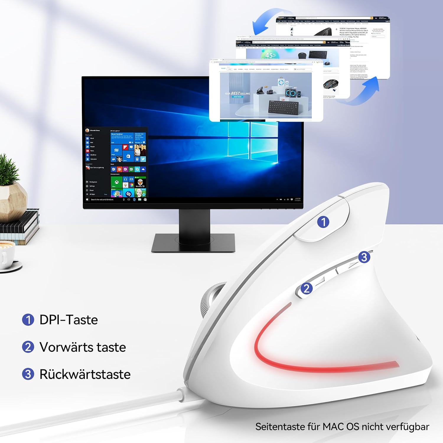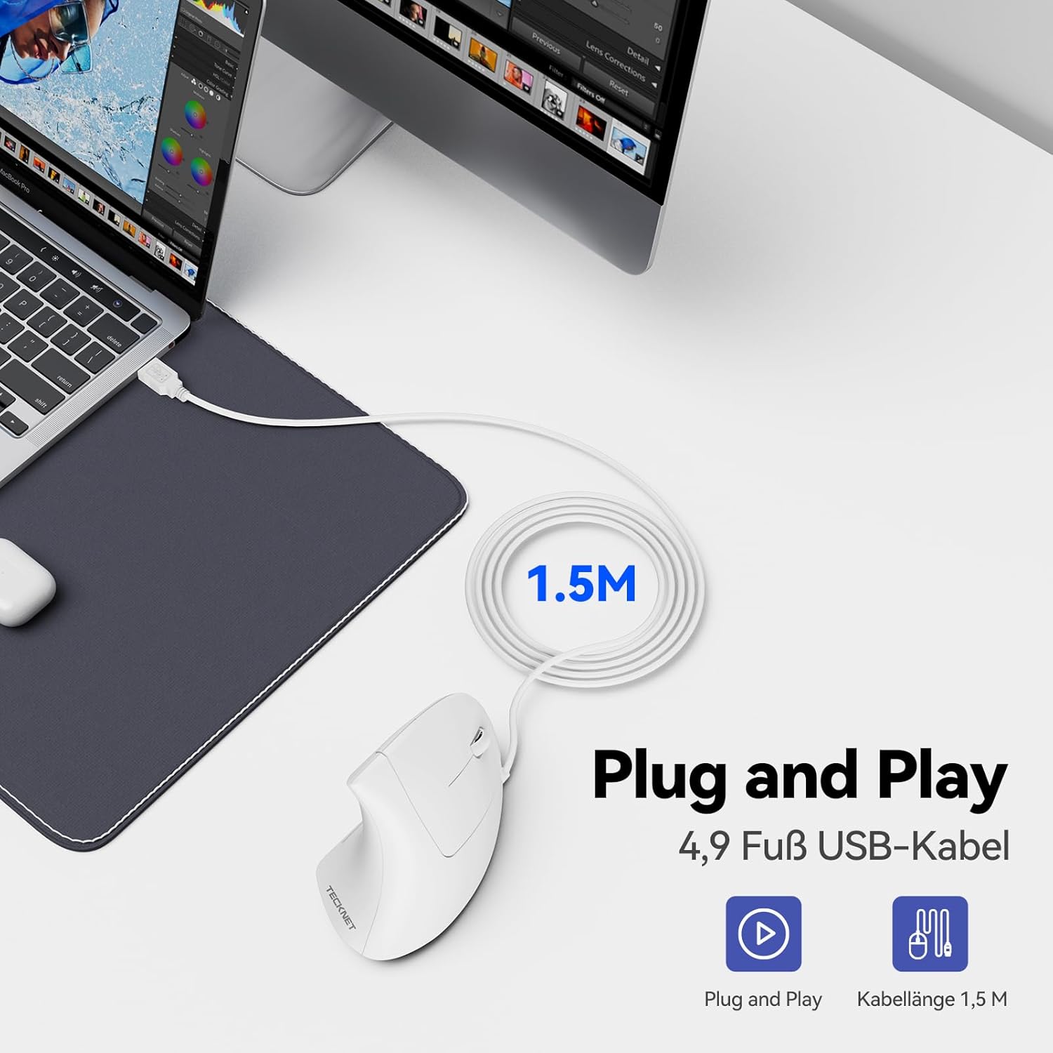 • Plug and Play: Просто свържете ергономичната мишка с 1,5-метровия USB кабел и започнете работа веднага. Червеното LED осветление на USB мишката осигурява приятна атмосфера. Компютърната мишка е добре съвместима с лаптопи, компютри с Windows и Mac OS.