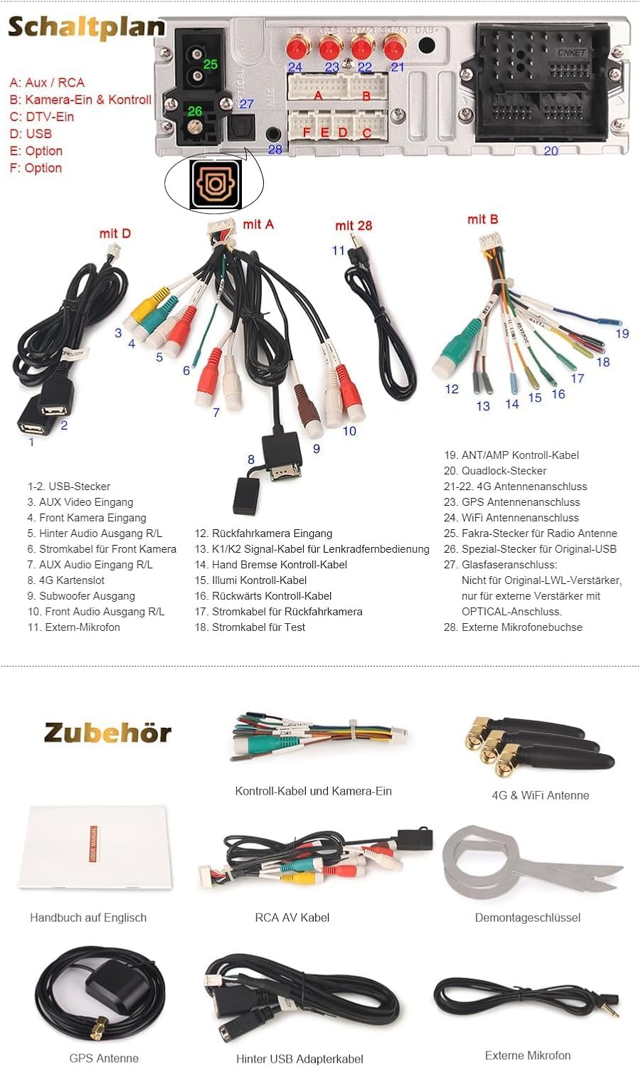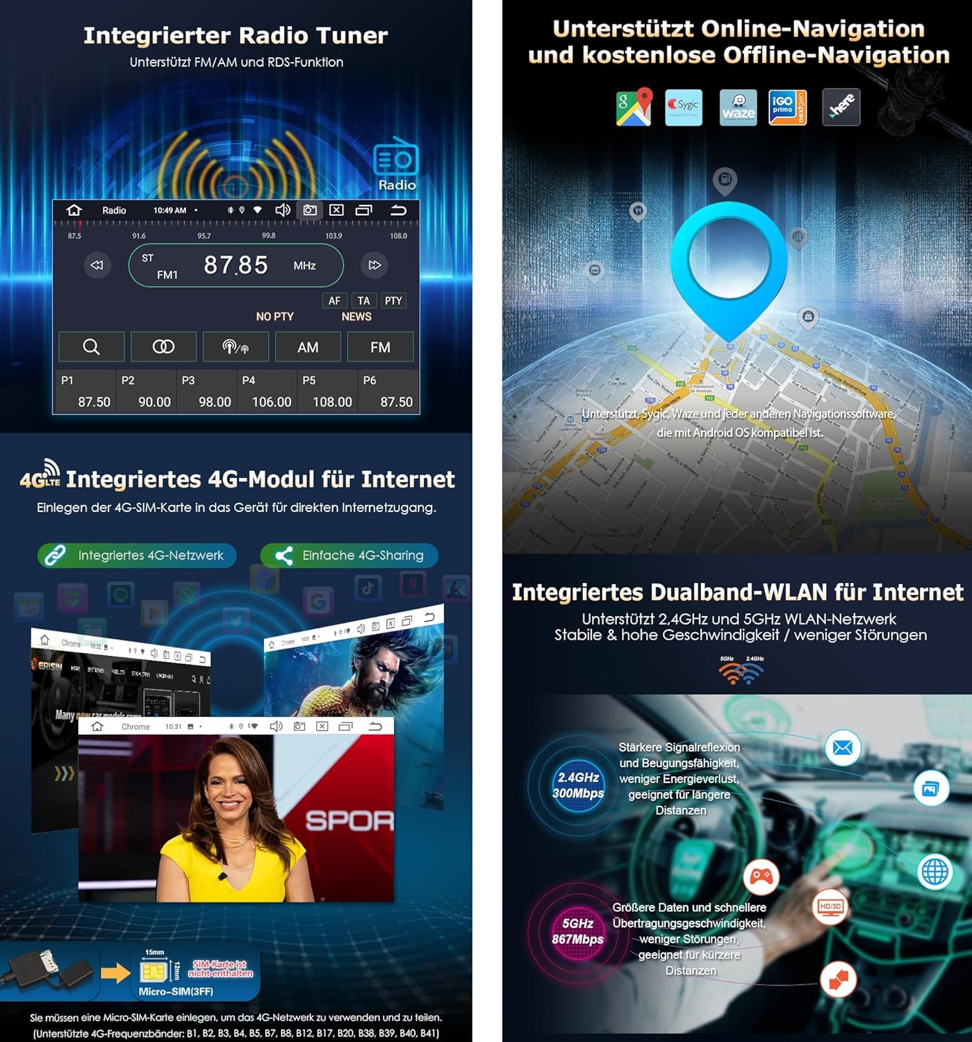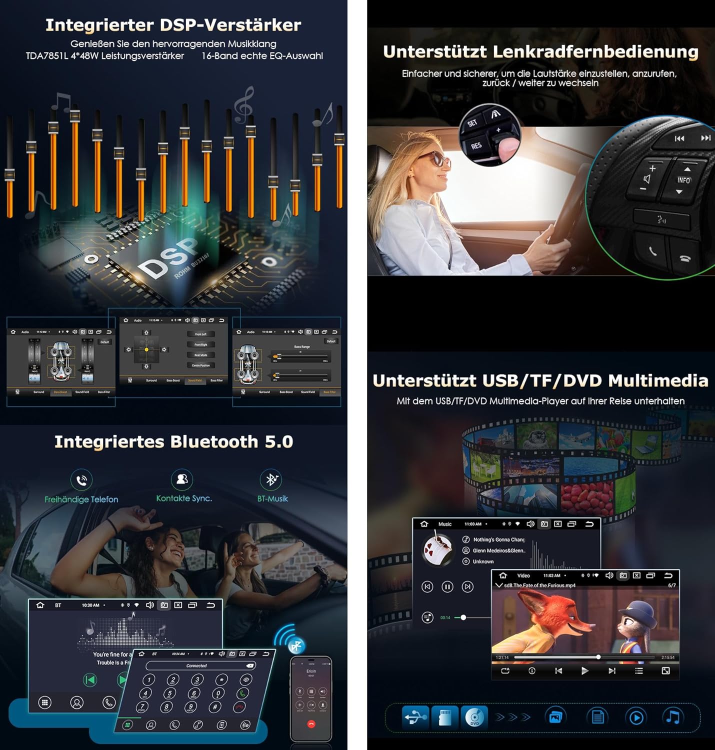 Android 12.0 OS, eight core, 2 x A75 + 6 x A55 64-bit 1800 MHz CPU architecture, benchmark results go over 170,000.4GB RAM and 64GB ROM, 1 card / 3 USB up to 4 x 256GB extended memory. Integrated DSP amplifier system with 16-band E. QQL selection, can perfect Bring sound effect to your car. Built-in STMicroelectronics TDA7851 amplifier (better than TDA7388) supports subwoofer and 4 x 48 W stereo sound. Integrated wireless Apple CarPlay and cable and wireless Android car. No need to use another adapter. The carplay function can be realized by connecting the mobile phone to Bluetooth and the Android car function can be realized by connecting the mobile phone with USB data cable or Bluetooth. Built-in Bluetooth 5.0 module, hands-free calls, BT music, phone book, display of the last call. Built-in GPS module that supports offline GPS navigation and prepares GPS function. Built-in dual band WiFi for 2.4 - GHz and 5 GHz WiFi band. Built-in 4G module for the Internet, supports 99% of network operators worldwide, supports micro SIM card. Built-in Android multimedia player, it can play music/video/photo from internal memory or external USB stick. Integrated USB, TF, radio, RDS, clock, calendar, calculator, chrome, Adobe reader. Supports DAB+, DVB-T/T2, TPMS, TPMS, OB2, DVR, camera, AVIN, video off, etc. Advanced functions. Supports CVBS and the latest 720P-25FPS / 720P-30FPS / 1080P-25FPS / 1080P-30FPS AHD rear view camera. Supports steering wheel remote control, driver can operate the product easier and safer. Intelligent UI design, you can use wallpaper, warm or cool colour and LED button. 2. Support split screen view, you can run two apps side by side.