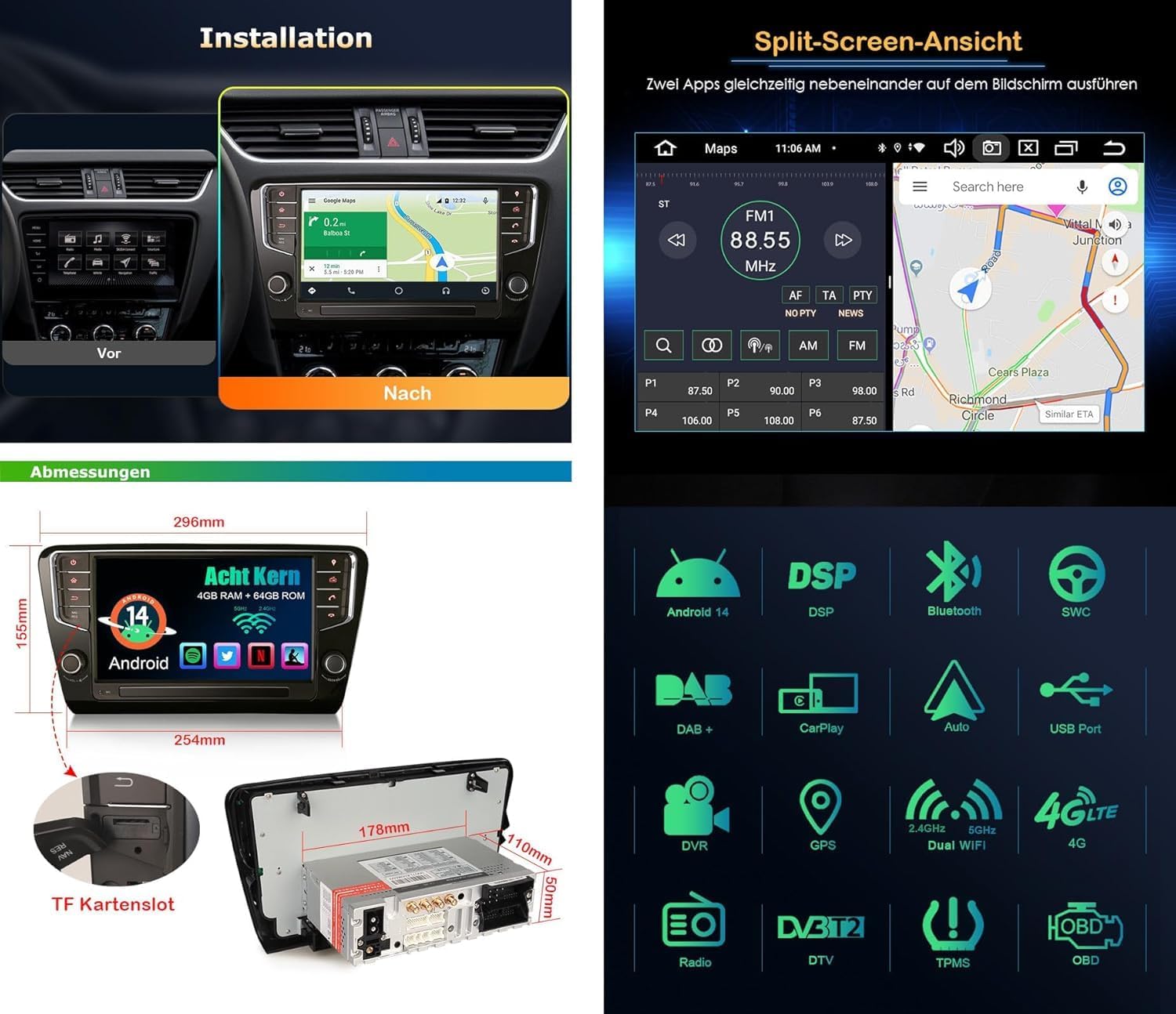 Please read the panel dimensions of 296 mm (top width) x 155 mm (high) x 254 mm (base width) and compare it with your dashboard or OEM radio/media before bidding to avoid errors. This device cannot fit Skoda Octavia MK2 2004-2013. If your OEM car radio/MP3 names Balero/Melody/Stream has the front panel dimensions of 256 mm (top width) x 126 mm (high) x 236 mm (base width), this device does not fit in your vehicle and you can use the other item ES8526S-TDE (ASIN: B09KL84XHW) in our shop.