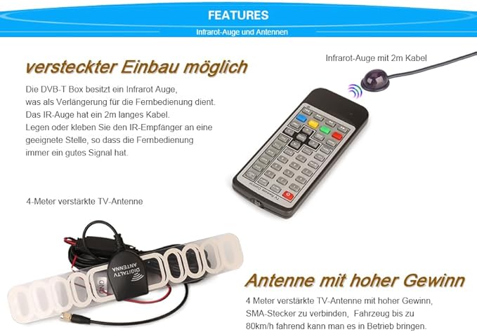 • Основни характеристики: напълно отговаря на стандарта DVB-T EN300 744 / DVB-T2 EN302 755. Благодарение на подсилените антени с висок коефициент на усилване, устройството може да приема сигнали до 80 км/ч. Благодарение на инфрачервения сензор за дистанционното управление с 2 м кабел, можете да инсталирате приемника скрито, например в жабката или в пространството за краката на пътника. Можете също така да записвате текущата телевизионна програма. За тази цел е необходим само USB флаш памет или USB твърд диск (до 32GB) като носител за съхранение.