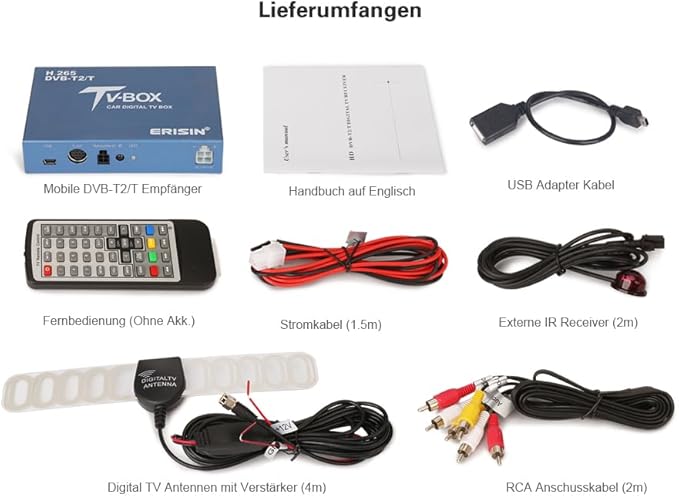 • Съдържание на кутията: 1 x мобилен DVB-T2/T приемник, 1 x ръководство на английски език, 1 x дистанционно управление (без батерия). - 1 x захранващ кабел (1,5 м) - 1 x външен IR приемник (2 м) - 1 x цифрова телевизионна антена с усилвател (4 м) - 1 x RCA свързващ кабел (2 м)