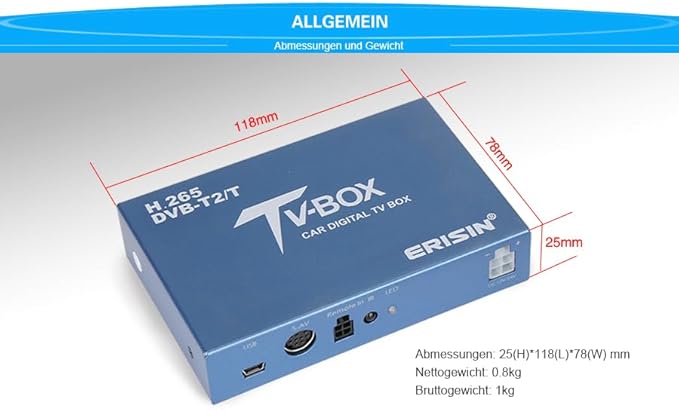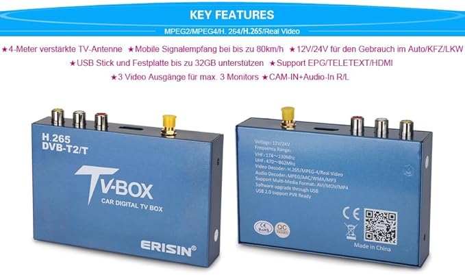 • Спецификация: Работа с 12 V/24 V – специално за употреба в автомобил/лека кола/камион – включена е 1 подсилена телевизионна антена с висок коефициент на усилване, приемане на сигнал до 80 км/ч. - Поддържа HEVC (H.265), H.264, MPEG-2, MPEG-4 като видео декодер (до 1920x1080P) - Поддържа PCM, AAC Leve12, ACC Leve14 като аудио декодер - Поддържа мултимедийни формати: MPG, MKV, AVI, MOV, WMA, MP4, MP3, AAC