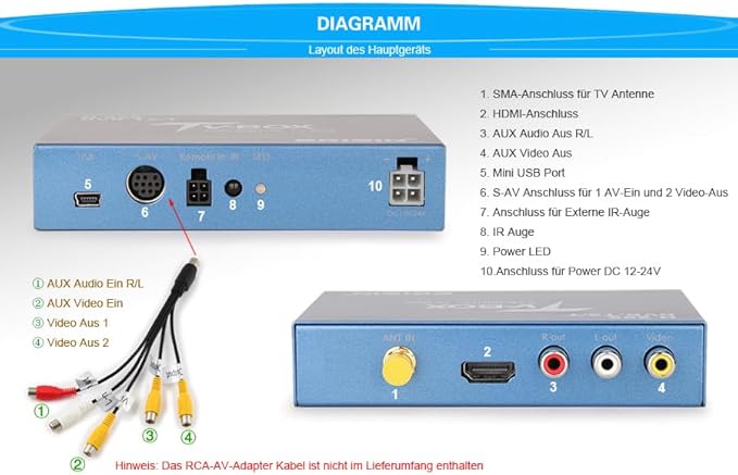 • 3 RCA Videoausgänge für den Anschluss 3er Monitore gleichzeitig