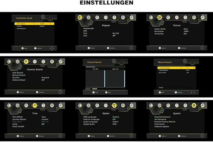 • 【Спецификация】- Поддържа бързо хардуерно декодиране на JPEG изображения - DVB субтитри ETSI 300473 и поддържа OSD ТЕЛЕТЕКСТ, който може да показва телетекст за информация за любимите ви станции - Езици на менюто/аудио/OSD: английски/френски/немски/италиански/испански/португалски/руски... - Електронен програмен справочник (EPG) Преглед на програмата и телетекст за днес, утре и седмия ден. - Поддържа автоматично/ръчно търсене
