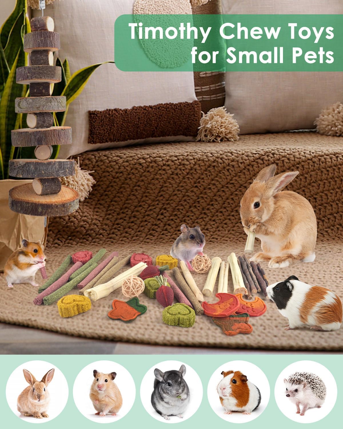 • ПЕРФЕКТНА ИЗНЕНАДА ЗА ВАШИТЕ ДОМАШНИ ЛЮБИМЦИ Комплектът играчки за дъвчене е подходящ за зайци, морски свинчета, чинчили, хамстери, джербили, плъхове, дегу, катерици, холандски лопатар, прерийни кучета, дегу, джербили и други малки животни. Може да отнеме известно време, докато вашите домашни любимци свикнат с него и се влюбят в него. Перфектни лакомства за дъвчене и дъвчене за морски свинчета, зайци, чинчили, хамстери и др.