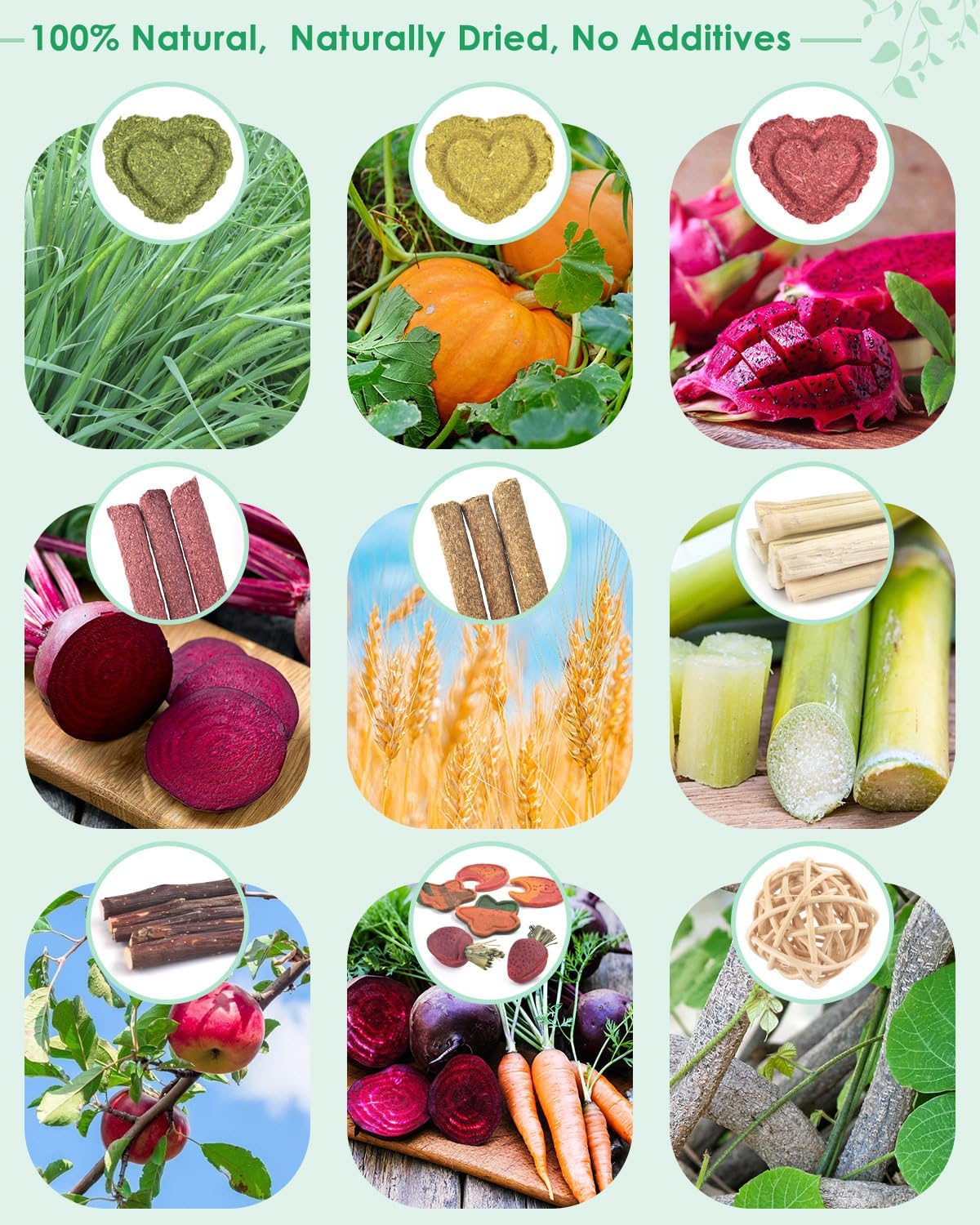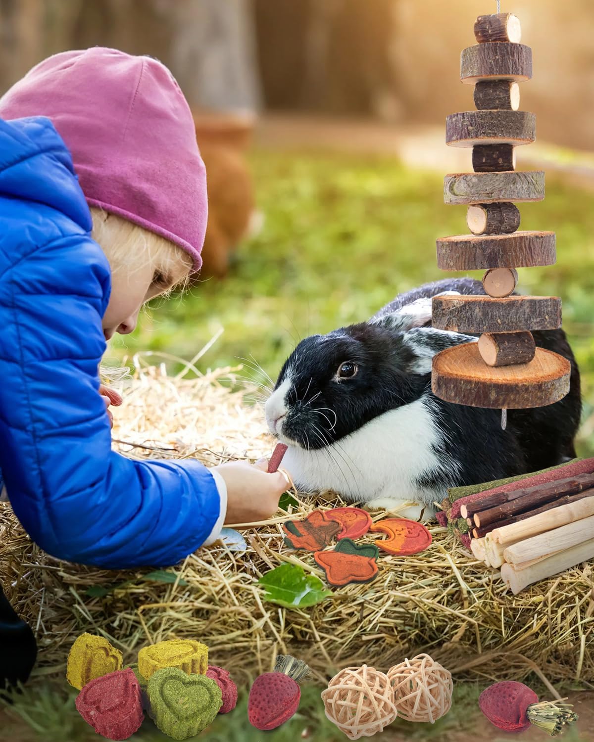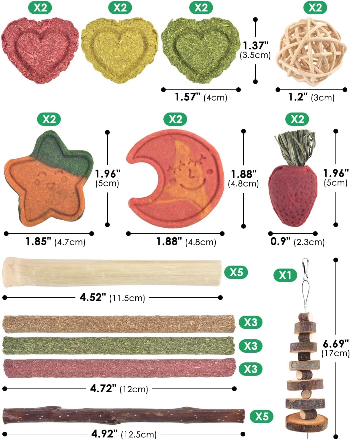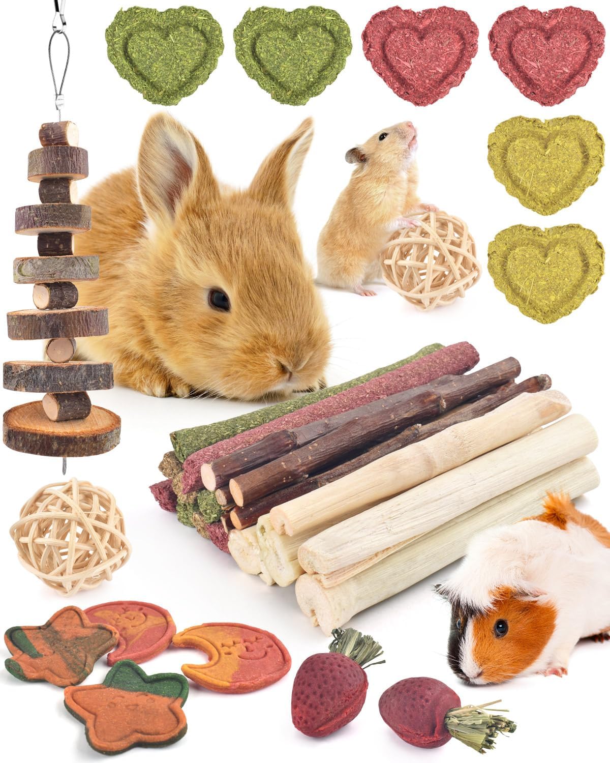 • 34 части аксесоари за зайци: комплектът играчки за дъвчене на зайци включва ябълков клон, естествени пръчици от тимотейка, ратанова топка, кекс от морковена трева, сладък бамбук, кекс от сено от цвекло, кекс от сено от пшенична трева, бисквитки с вкус на тиква, бисквитки с вкус на драконов плод. Тези играчки позволяват на зайците да се катерят и да почиват, което е продължително и повишава активността. Тази висококачествена и завладяваща селекция от лакомства за зайци е идеална за вашите малки приятели.