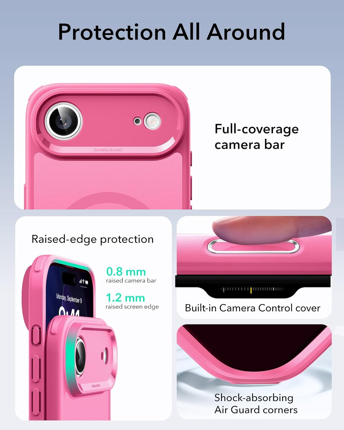• [Повишена цялостна защита за дисплея и камерата] за калъф за iPhone 17 Pro с MagSafe: повдигнатите ръбове на дисплея и рамката на обектива, предпазваща камерата от всички страни, не само осигуряват подобрена защита от надраскване, но и ефективно предпазват от повреда на дисплея и обектива на камерата в случай на падане - независимо дали е изпуснат случайно от масичката за кафе или е силно ударен върху каменен под.