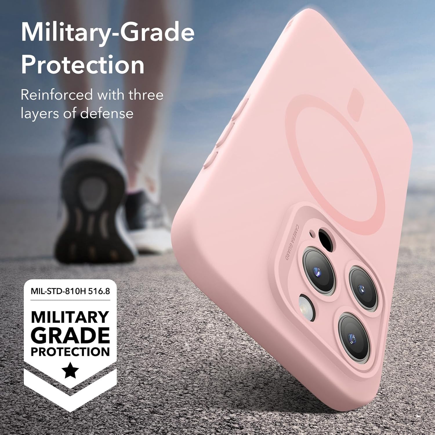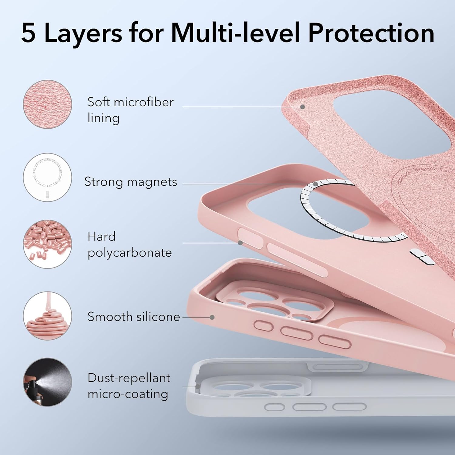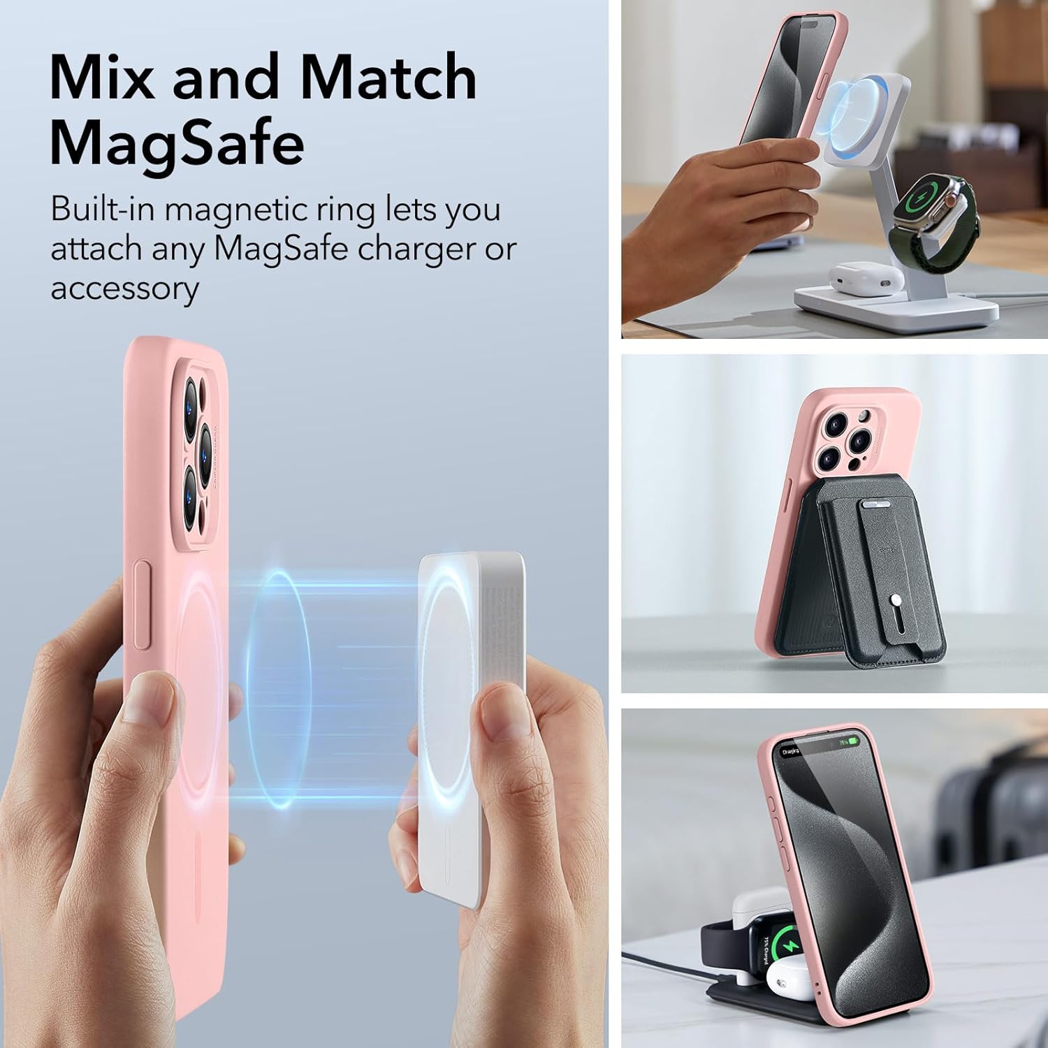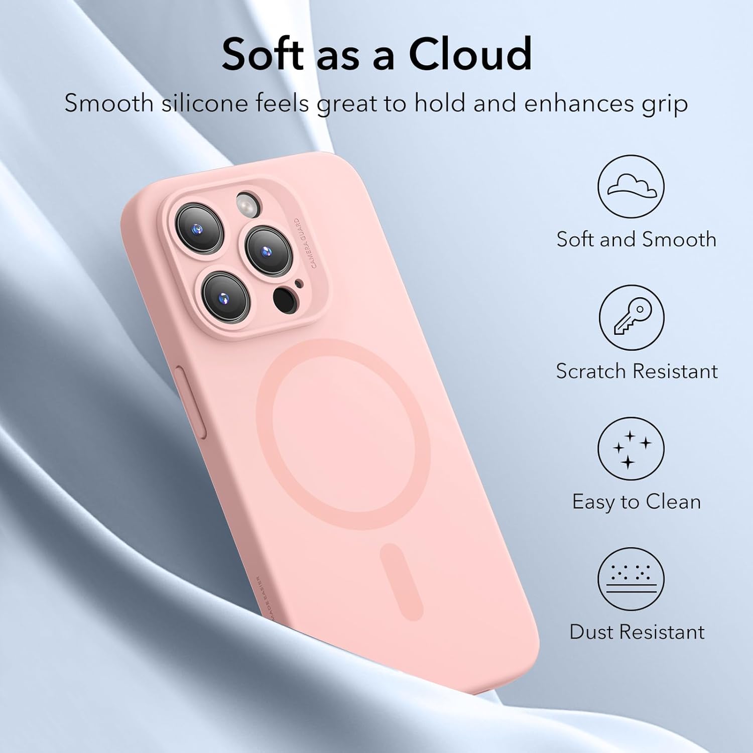 ESR калъф за iPhone 15 Pro, съвместим с MagSafe, поддържа магнитно зареждане, тънък калъф за мобилен телефон, изработен от течен силикон, ударопоглъщащ калъф, защита на екрана и камерата, серия Cloud, розов