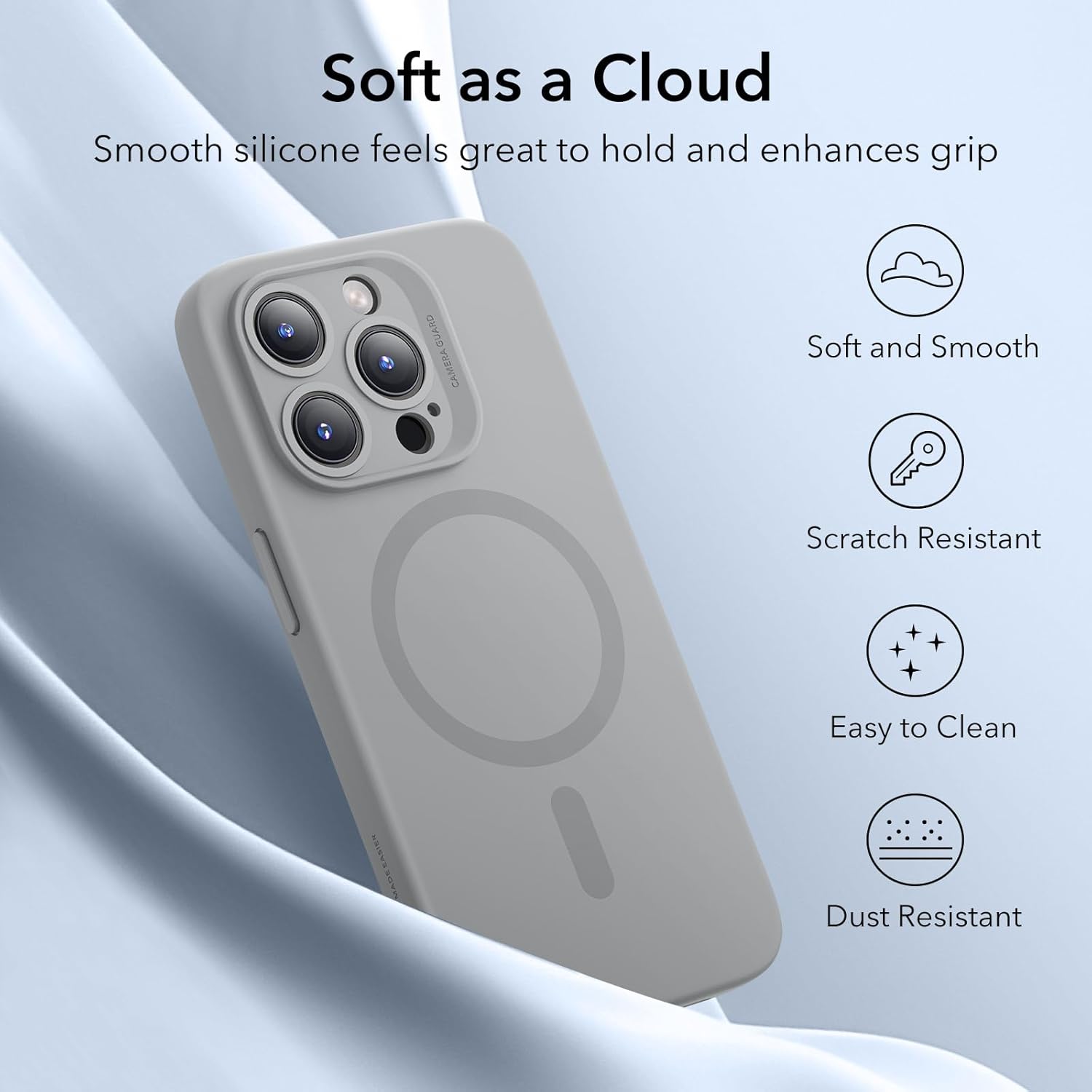 ESR калъф за iPhone 15 Pro, съвместим с MagSafe, поддържа магнитно зареждане, тънък калъф за мобилен телефон, изработен от течен силикон, ударопоглъщащ калъф, защита на екрана и камерата, серия Cloud, сив