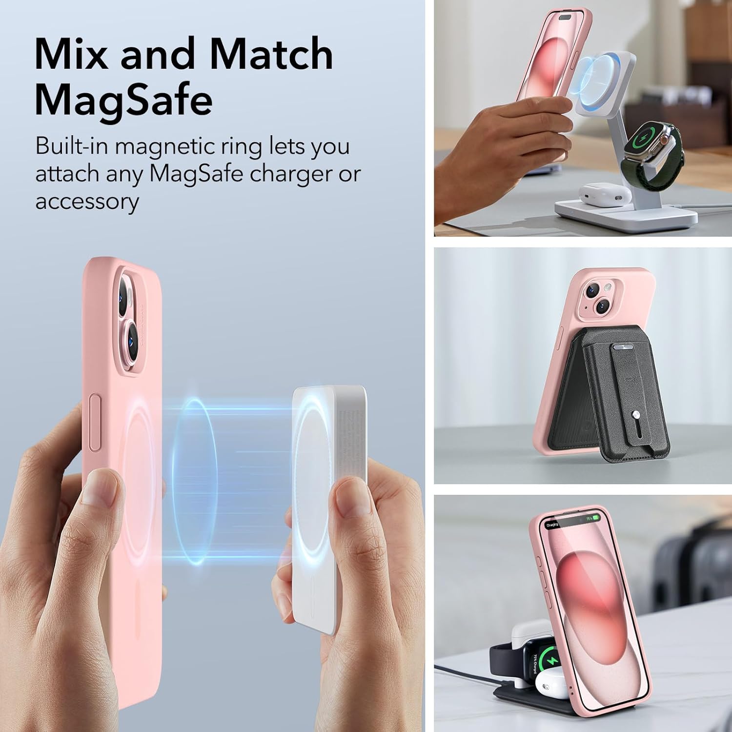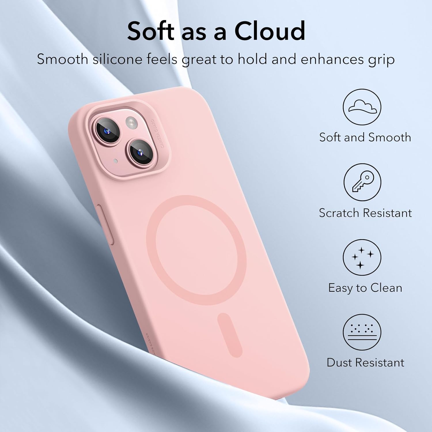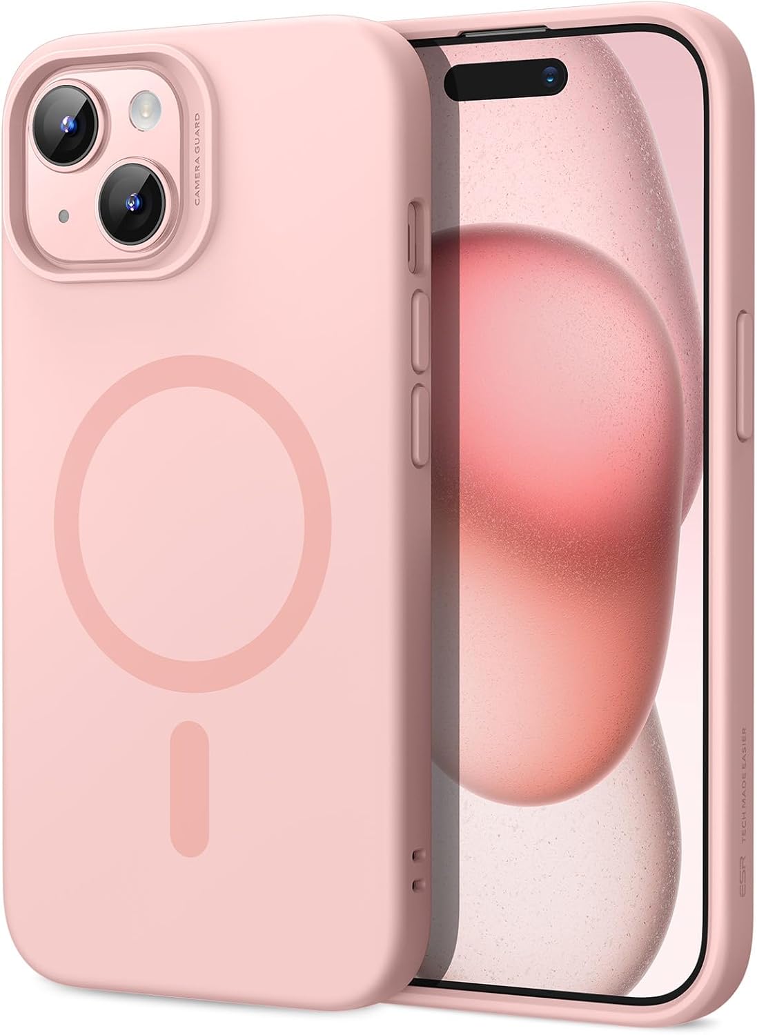 ESR калъф за iPhone 15, съвместим с MagSafe, поддържа магнитно зареждане, тънък калъф за мобилен телефон за iPhone 15, изработен от течен силикон, ударопоглъщаща защита на дисплея и камерата, розов