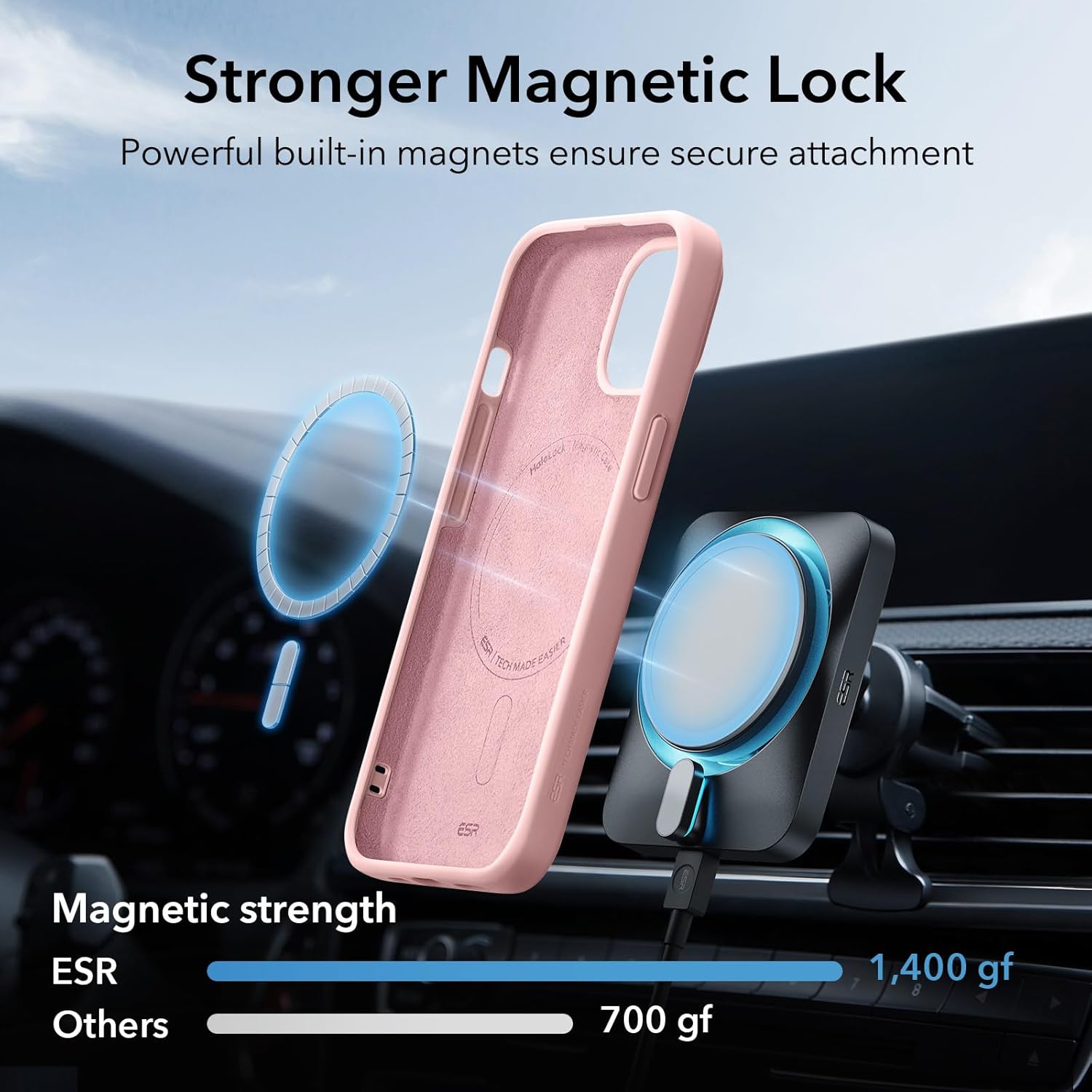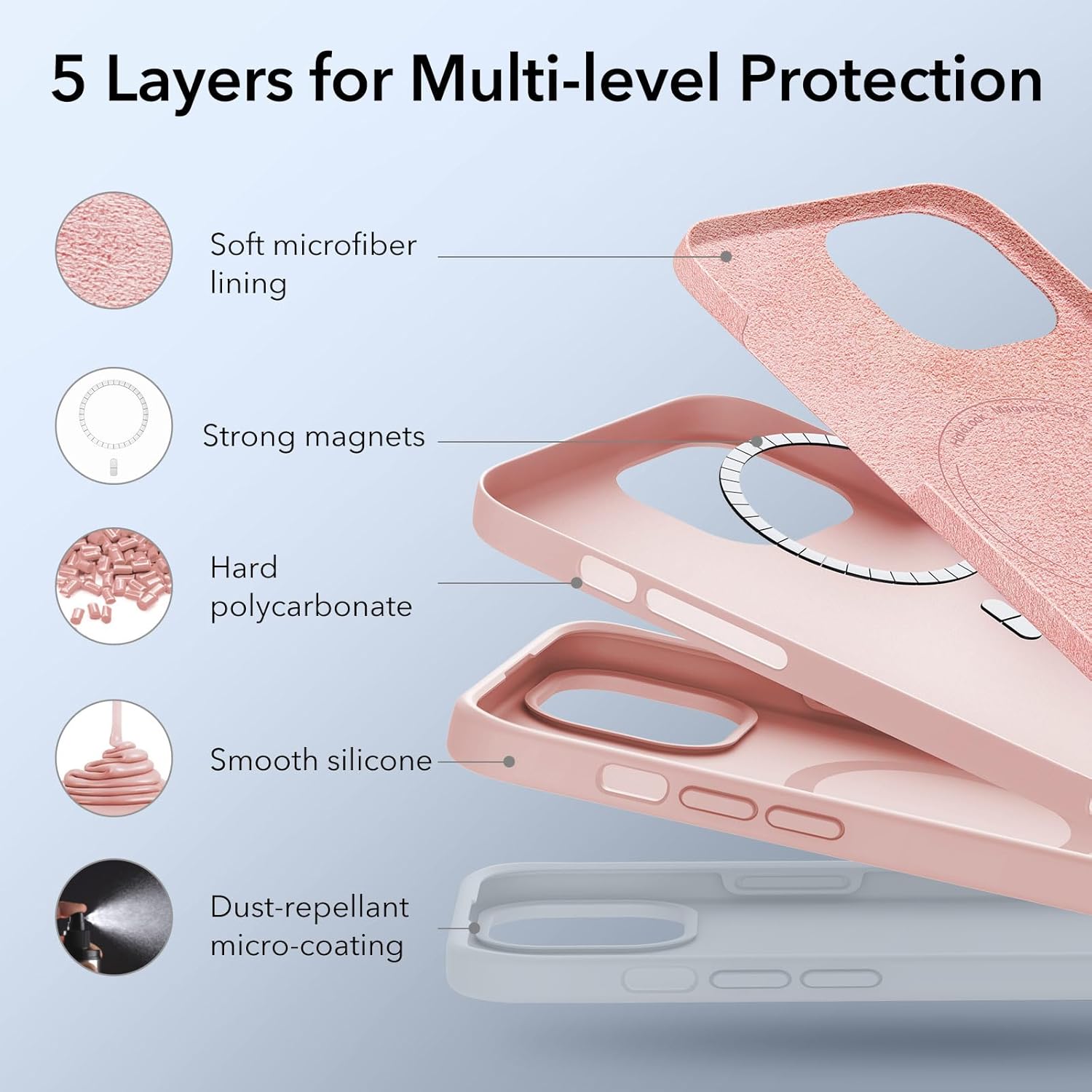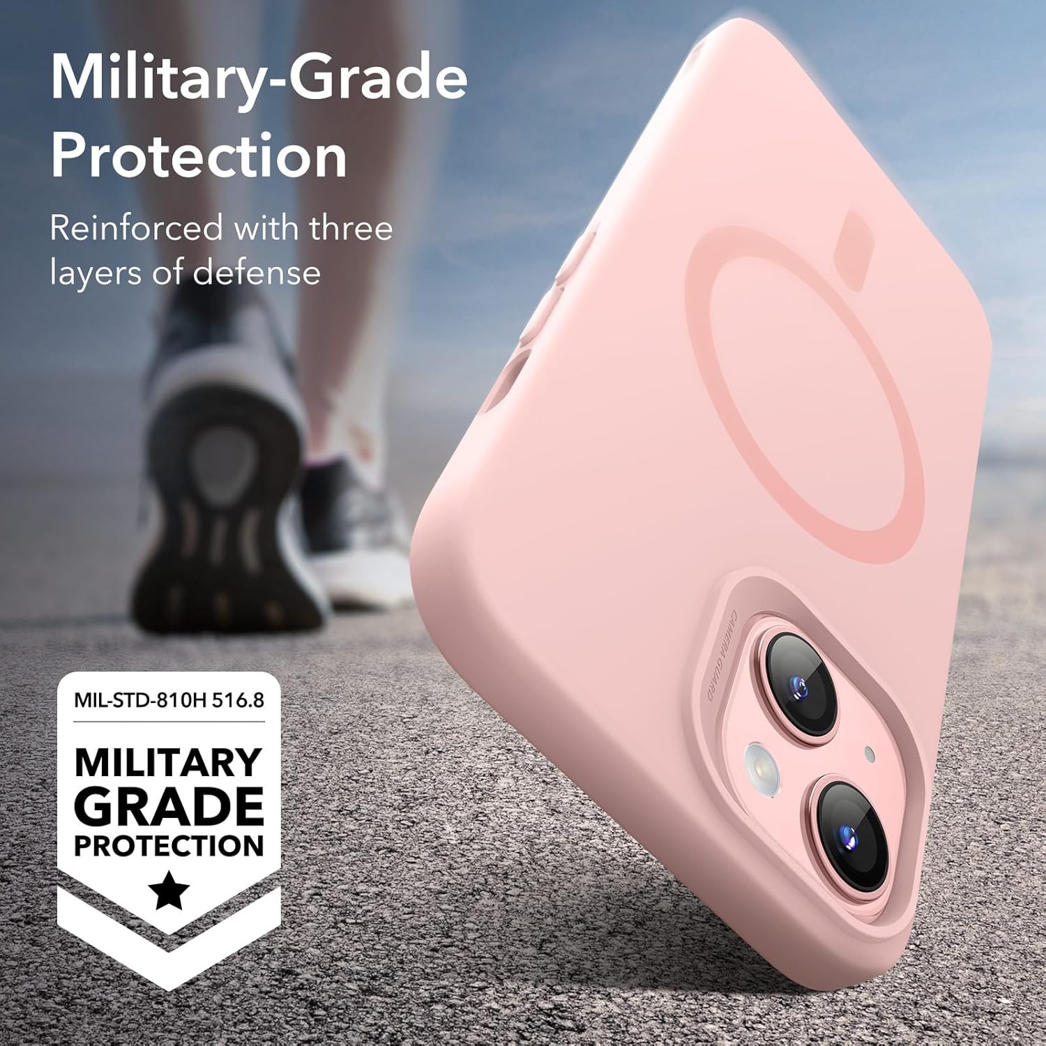 ESR калъф за iPhone 15, съвместим с MagSafe, поддържа магнитно зареждане, тънък калъф за мобилен телефон за iPhone 15, изработен от течен силикон, ударопоглъщаща защита на дисплея и камерата, розов