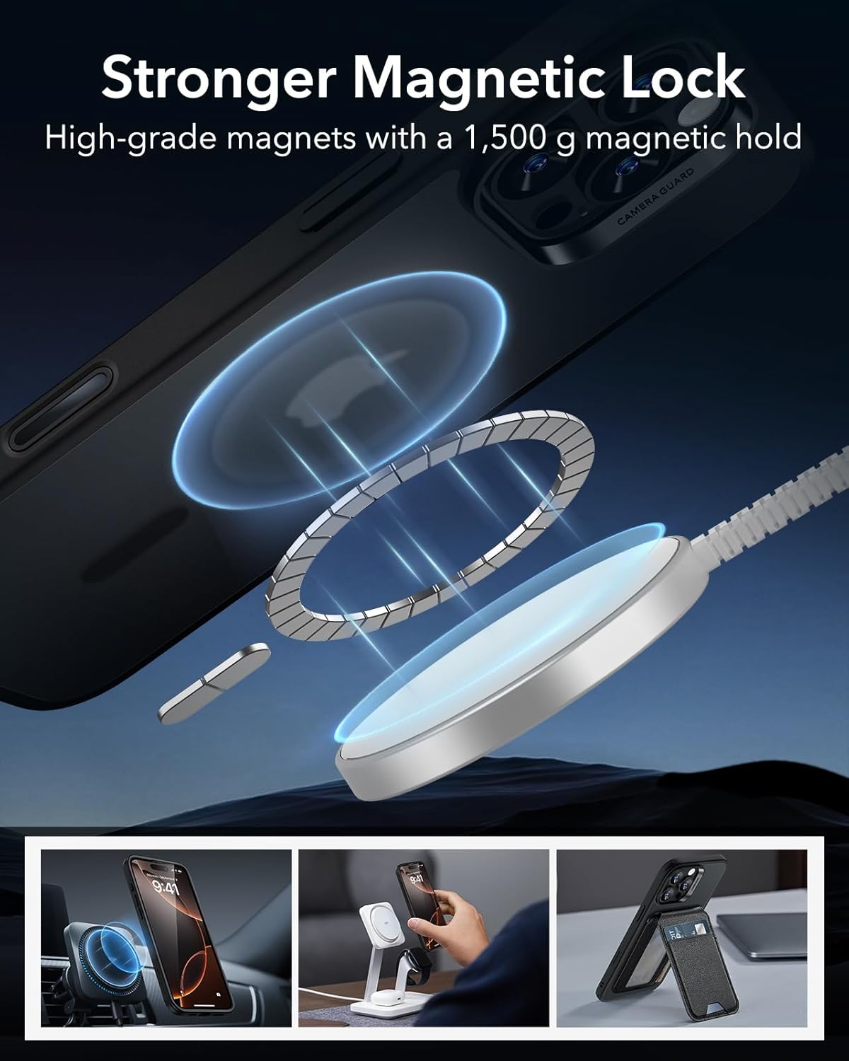 • Магнитна сила от 1500 g - ултрастабилни: Нашите специални магнити с водеща в индустрията сила на задържане от 1500 g закрепват аксесоарите MagSafe за мобилен телефон iPhone 17 Pro дори по време на дейности на открито - независимо дали става въпрос за бягане по пътеки, стълбове и камъни или за неравни пътища. Магнитният композит е толкова стабилен, че зарядните устройства, дръжките или държачите не се плъзгат дори при най-силните удари, като същевременно позволяват лесно отстраняване с лек натиск.