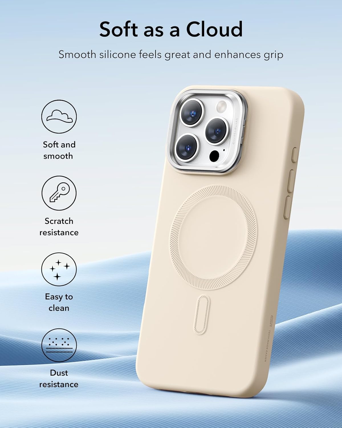 ESR Калъф за iPhone 16 Pro Max, Силиконов калъф със стойка, Съвместим с MagSafe, Вградена стойка за камера, Магнитен калъф за телефон за iPhone 16 Pro Max, Серия Cloud, Бежов