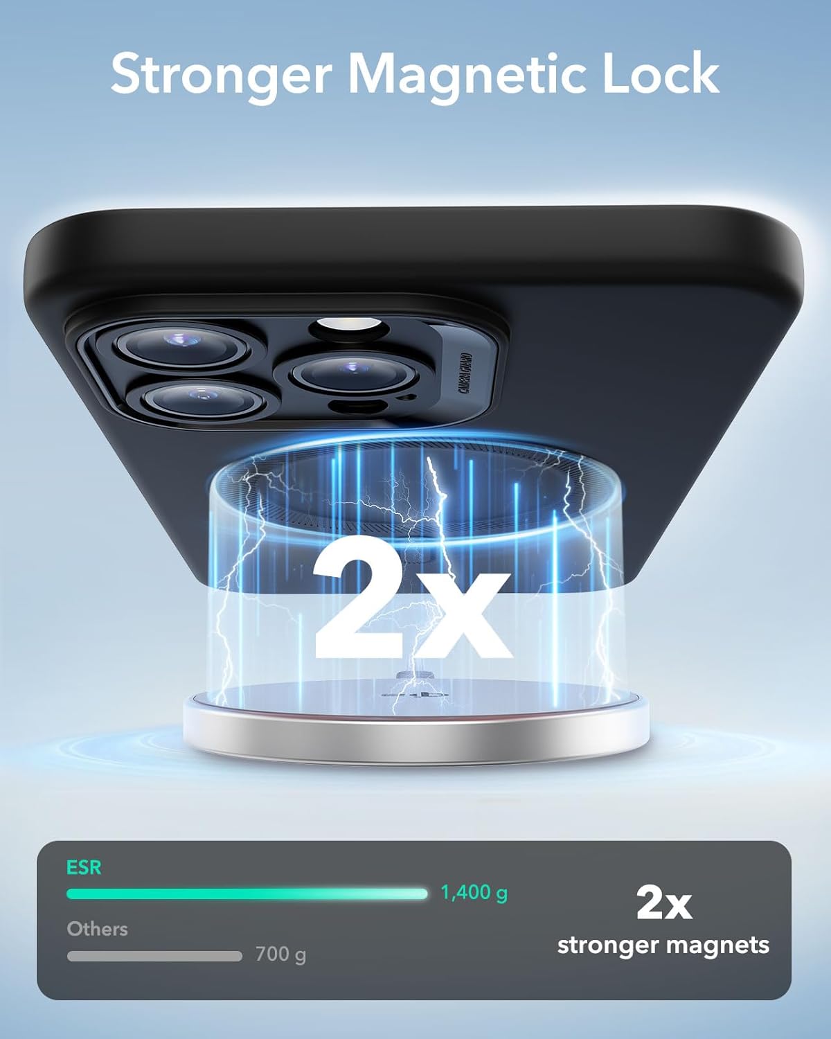 • Магнитна сила от 1500 g - ултрастабилни: Нашите специални магнити с водеща в индустрията сила на задържане от 1500 g закрепват аксесоарите MagSafe за мобилен телефон iPhone 17 Pro дори по време на дейности на открито - независимо дали става въпрос за бягане по пътеки, стълбове и камъни или за неравни пътища. Магнитният композит е толкова стабилен, че зарядните устройства, дръжките или държачите не се плъзгат дори при най-силните удари, като същевременно позволяват лесно отстраняване с лек натиск.