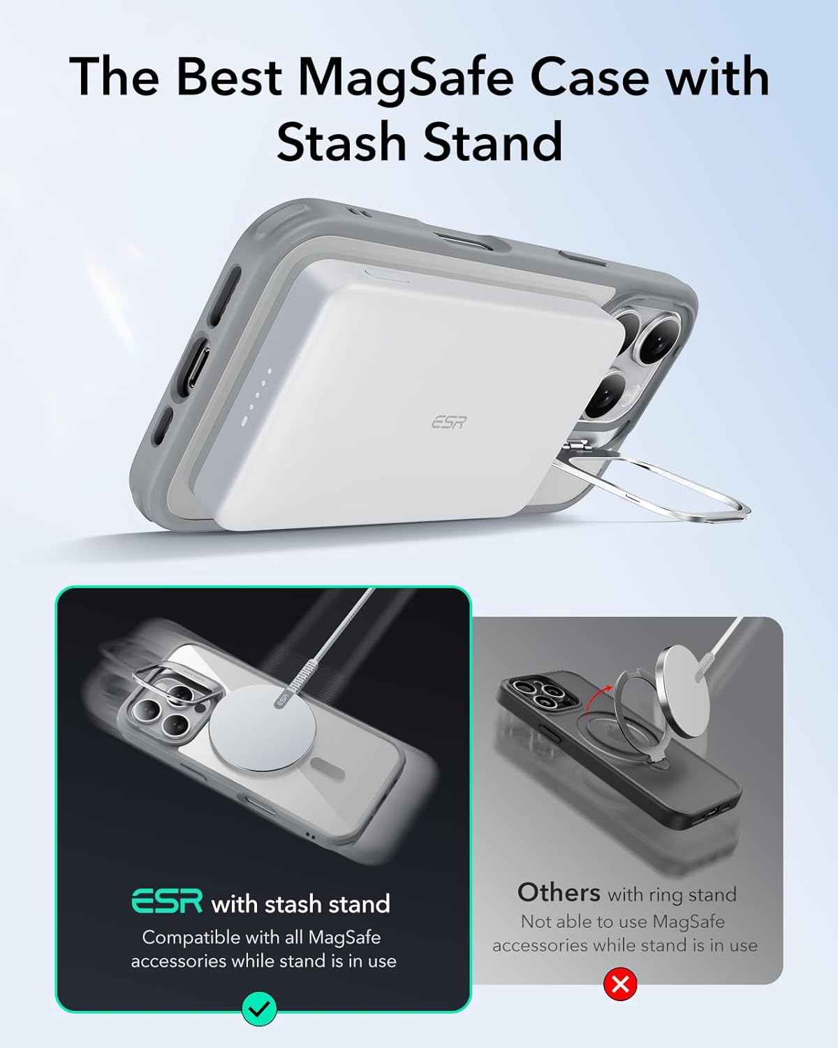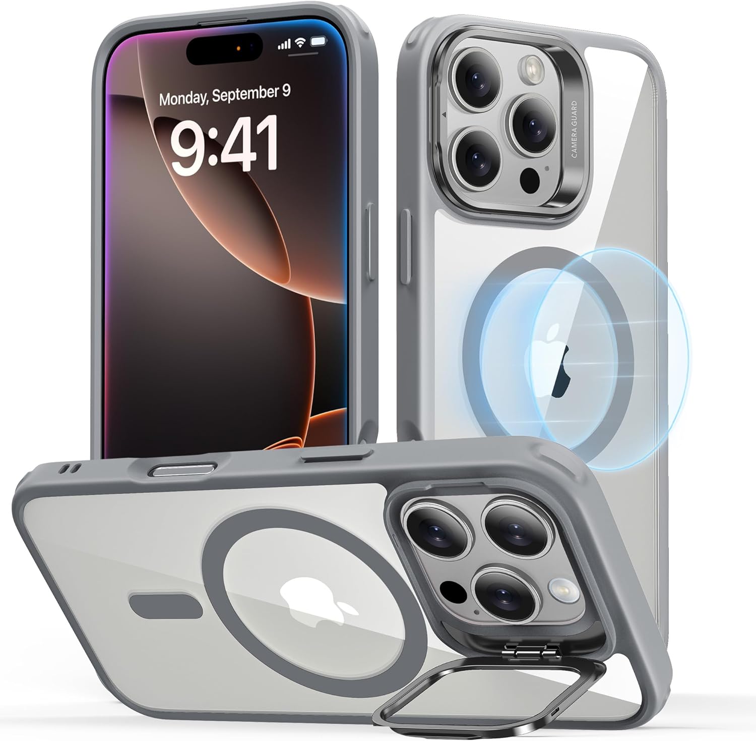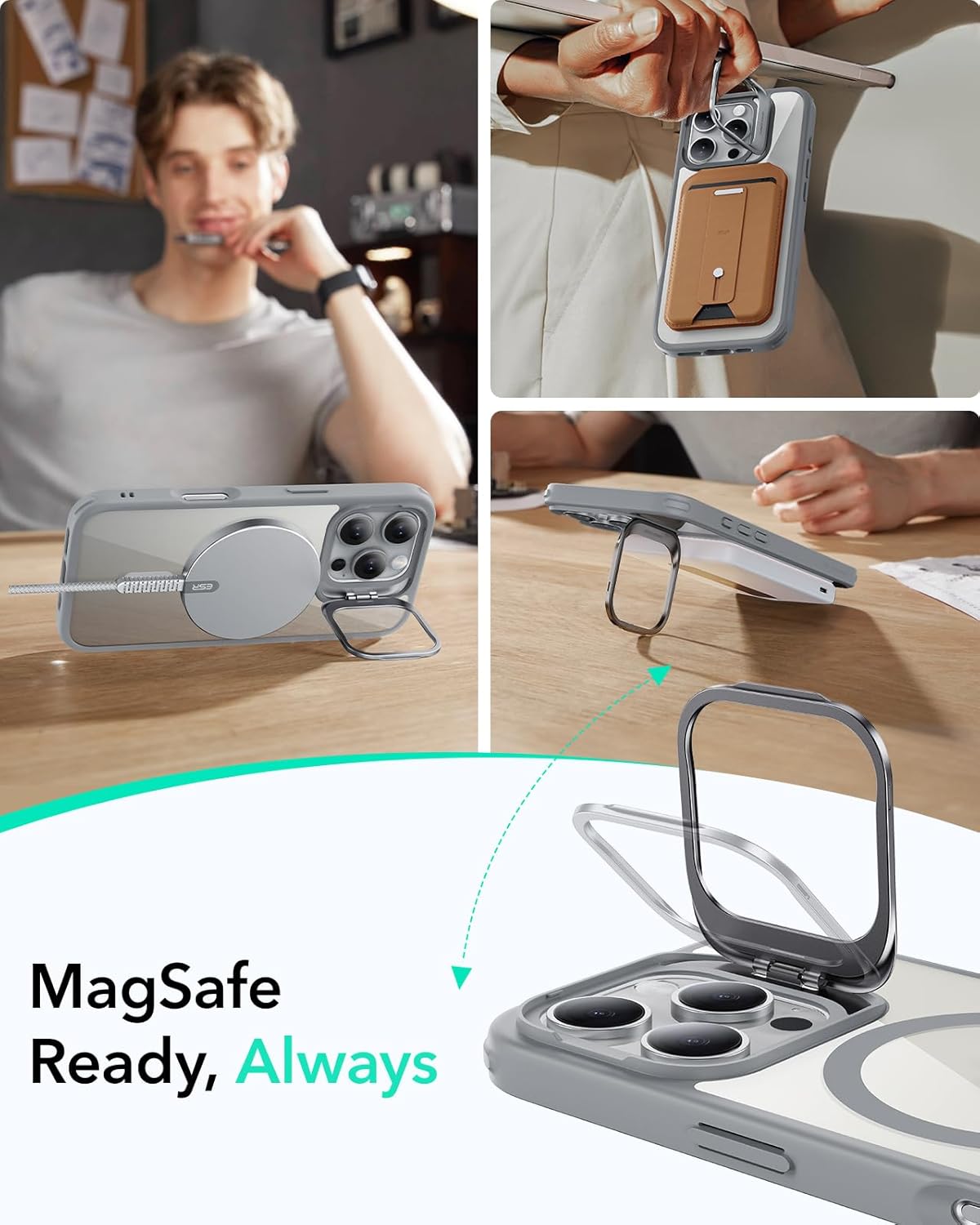 • Регулируема скрита стойка: Позиционирана около рамката на камерата, за да остане скрита, когато е сгъната, докато пръстенът MagSafe остава 100% свободен; насладете се на регулируем и стабилен изглед, за да гледате предавания по всяко време и навсякъде. Този калъф за мобилен телефон iPhone 17 Pro Max ви предлага оптимален комфорт.