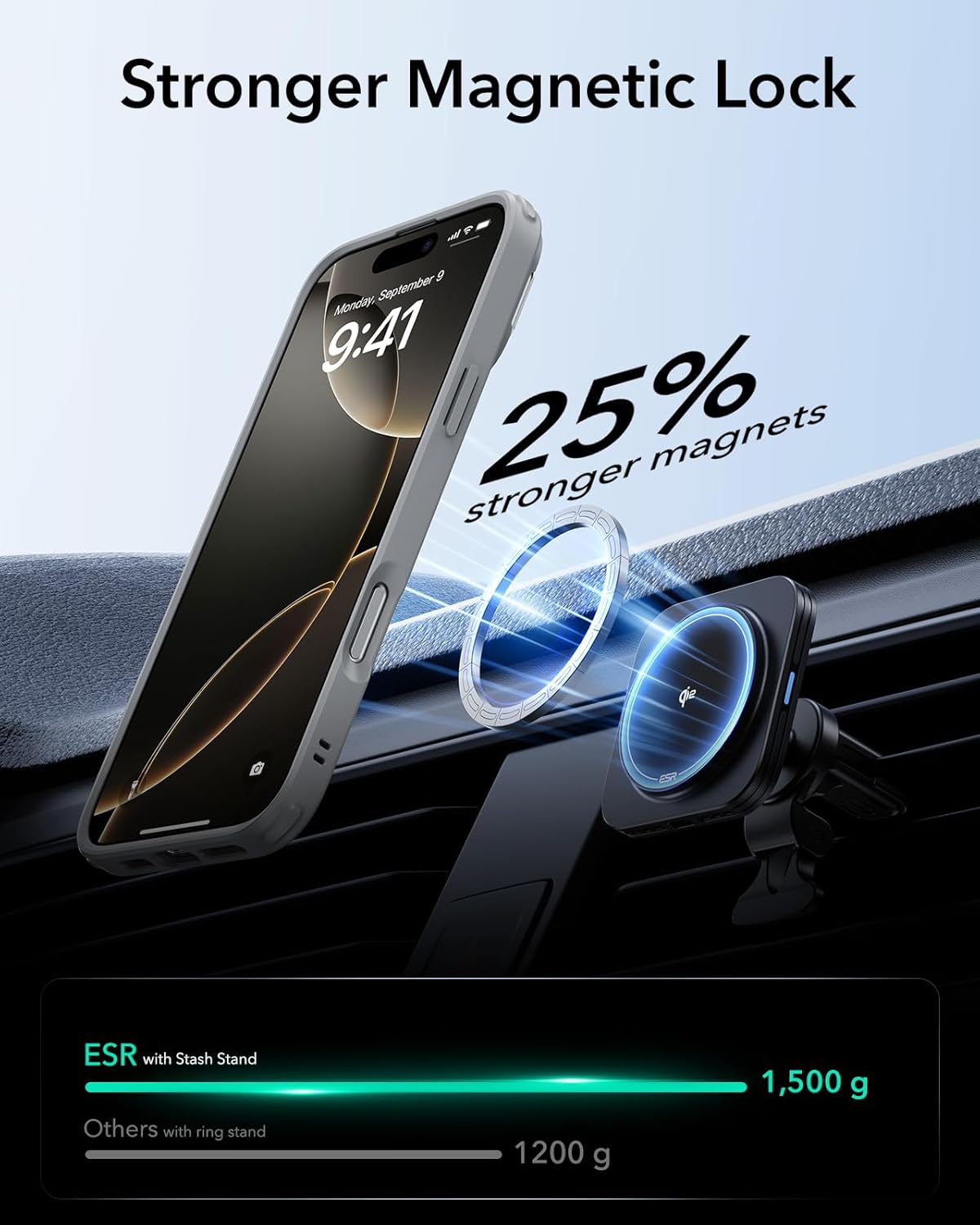 • [По-здраво магнитно затваряне] Силните вградени магнити със сила на задържане от 1500 g позволяват по-бързо и лесно безжично зареждане на място, както и носене със себе си и сигурно затваряне на всеки MagSafe аксесоар. Идеален за вашия iPhone 17 Pro Max калъф MagSafe.
