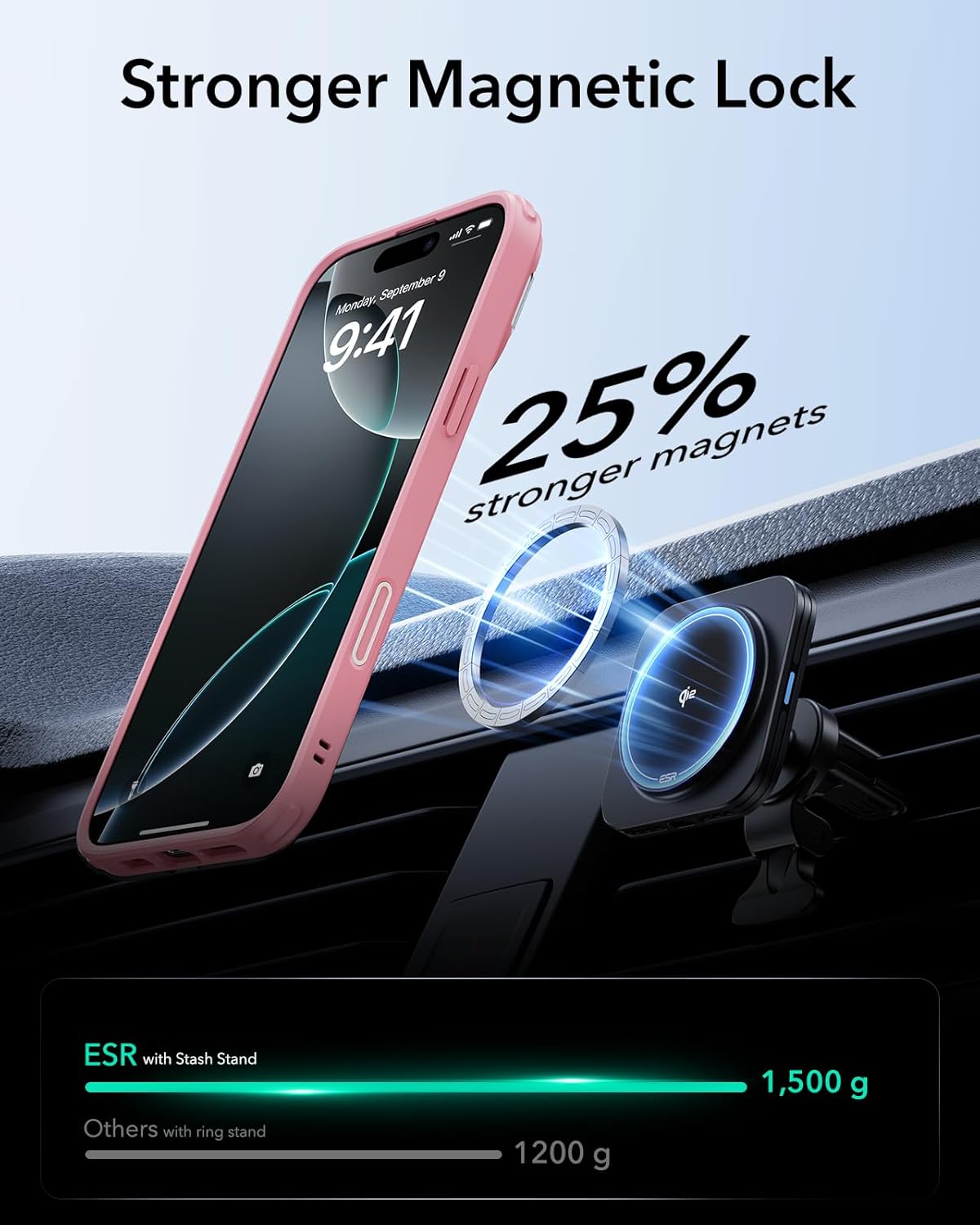 • [По-здраво магнитно затваряне] Силните вградени магнити със сила на задържане от 1500 g позволяват по-бързо и лесно безжично зареждане на място, както и носене със себе си и сигурно затваряне на всеки MagSafe аксесоар. Идеален за вашия iPhone 17 Pro Max калъф MagSafe.