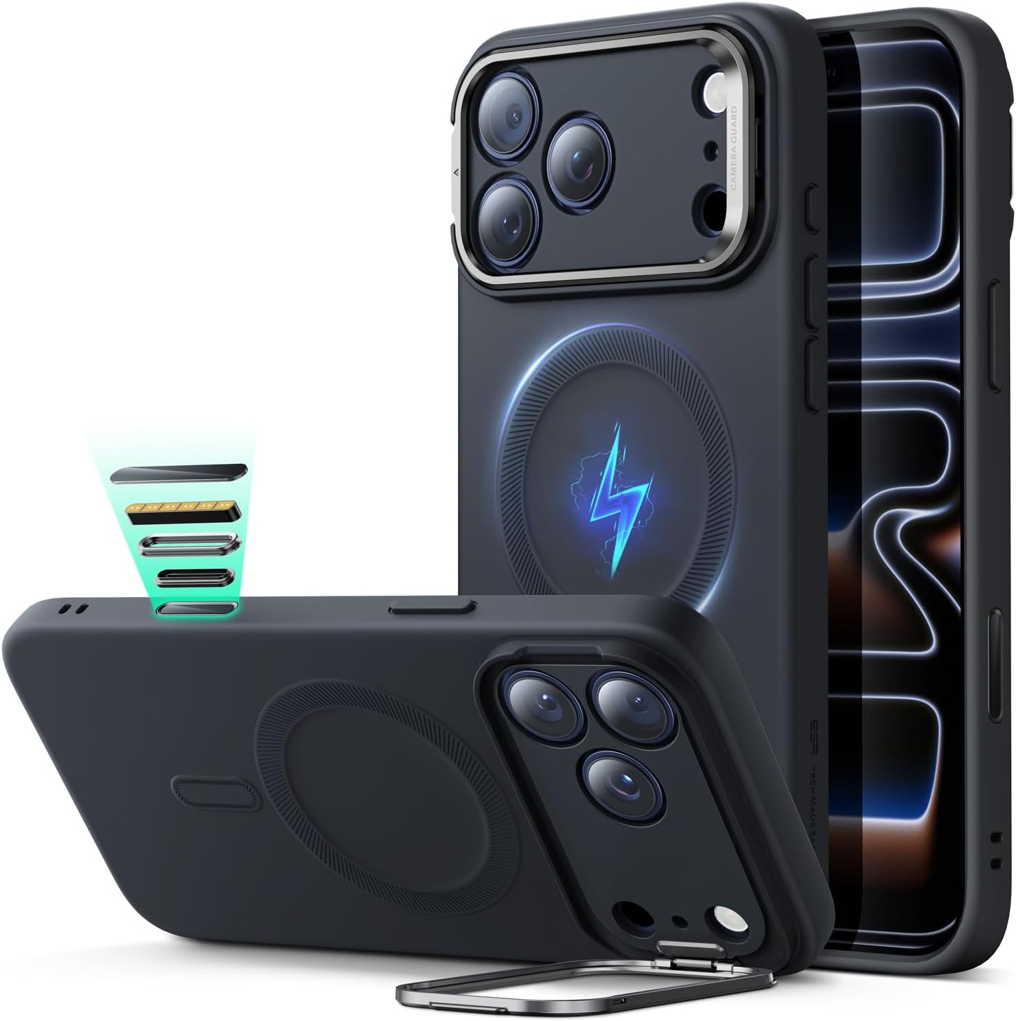 ESR калъф за iPhone 17 Pro, контрол на камерата, силиконов калъф със стойка, съвместим с MagSafe, вградена стойка за камера, магнитен калъф за мобилен телефон за iPhone 17 Pro, черен