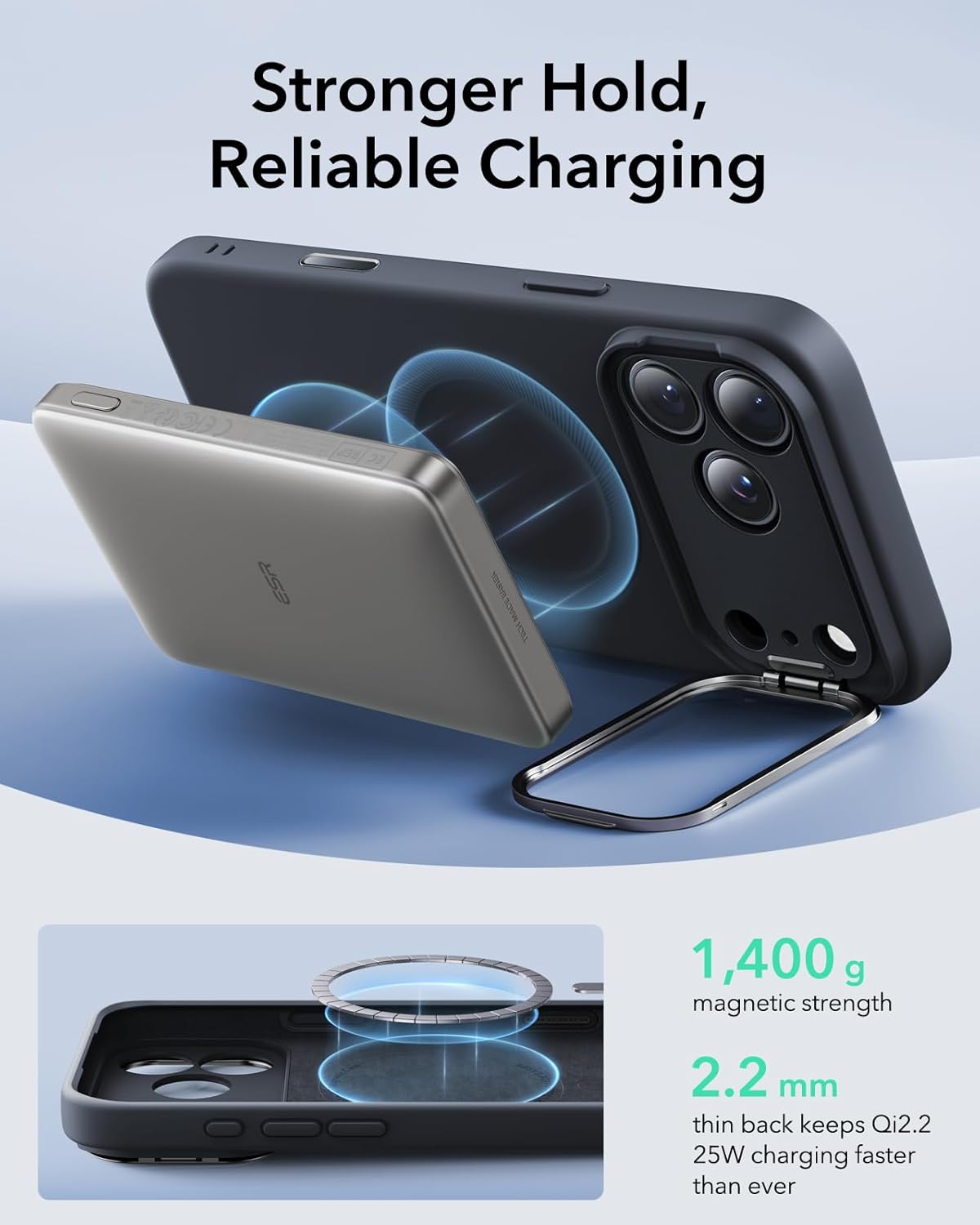 • [По-здраво магнитно затваряне] Силните вградени магнити със сила на задържане от 1500 g позволяват по-бързо и лесно безжично зареждане на място, както и носене със себе си и сигурно затваряне на всеки MagSafe аксесоар. Идеален за вашия iPhone 17 Pro Max калъф MagSafe.