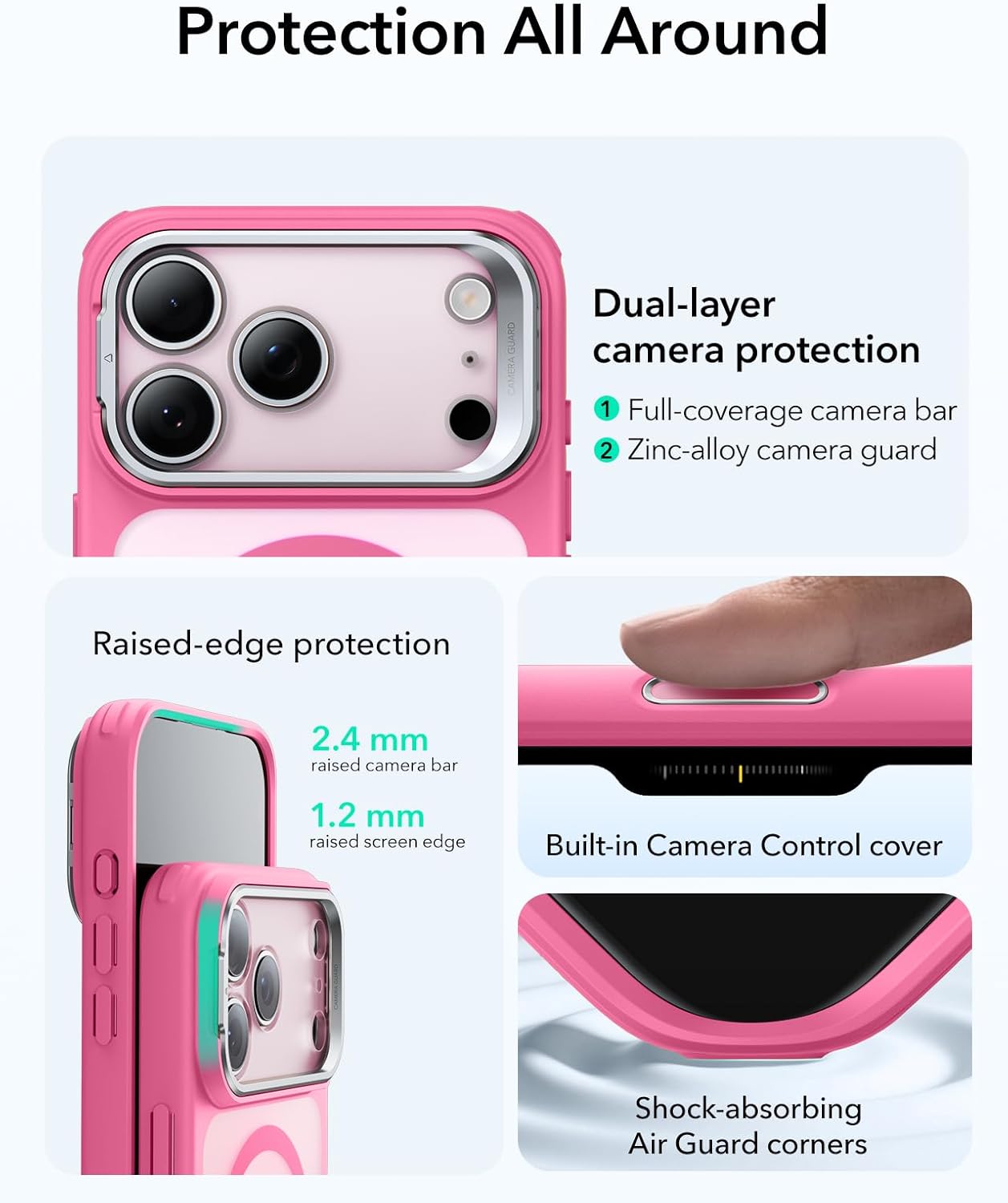 ESR калъф за iPhone 17 Pro, контрол на камерата, съвместим с MagSafe, защитен калъф по военен стандарт, вградена скрита стойка, калъф за мобилен телефон, устойчив на надраскване гръб, серия Classic, матово розов