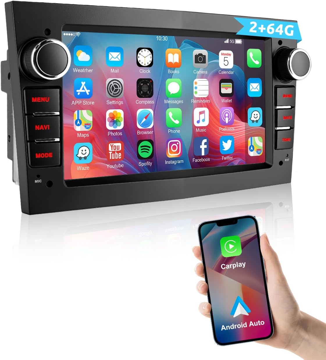 ESSGOO 2+64G безжично автомобилно радио Android 14 с Carplay и Android за Opel Astra H Corsa C/D Vectra C Zafira 7-инчов IPS сензорен екран Bluetooth FM RDS GPS Черен микрофон
