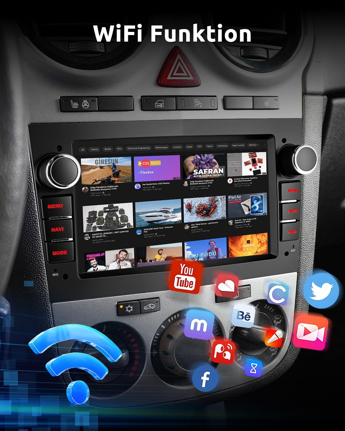 • Навигационна система и WiFi: Това автомобилно радио за Opel Corsa поддържа WiFi връзка. Независимата антена осигурява мощен WiFi прием. След свързване към WiFi можете да изтеглите всяко приложение от App Store, включително автомобилно радио с GPS, точно позициониране, стабилен сигнал и поддръжка на онлайн или офлайн карти, така че вече не е нужно да се притеснявате, че ще се изгубите на пътя.