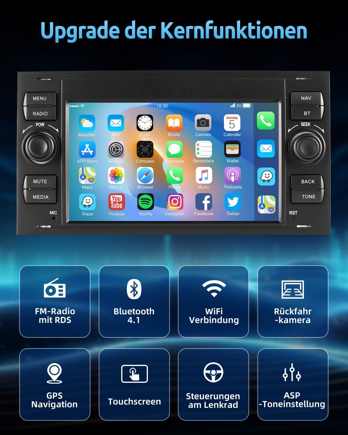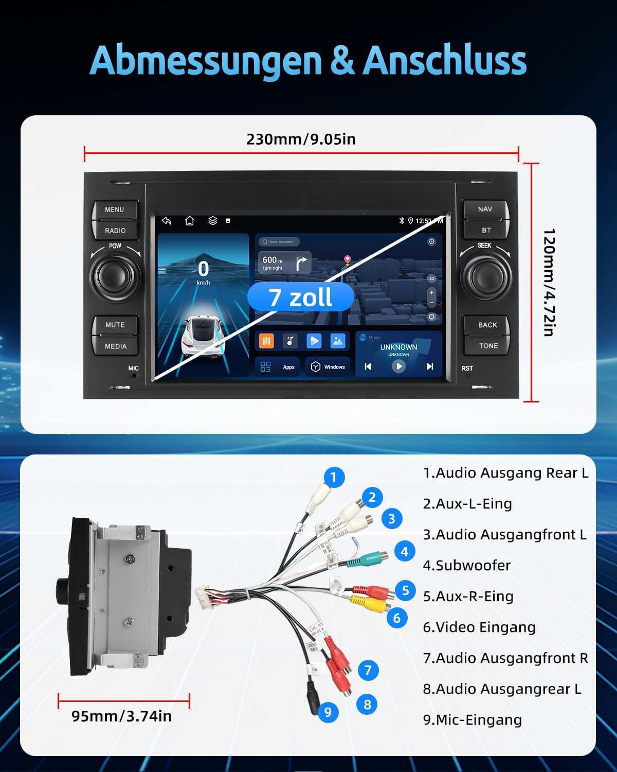• Приложими модели: това автомобилно радио е подходящо за Ford C-Max (2007-2009), Ford Connect (2007-2009), Ford Fiesta [MK5] (2005-2008), Ford Focus [MK2] (2004-2007), Ford Fusion (2006-2011), Ford Galaxy [MK2] (2006-2008), Ford Kuga [MK1] (2008-2012), Ford S-Max (2007-2009), Ford Transit [MK7] (2005-2014), Ford Transit Connect [MK7] (2005-2012). Ако вашият автомобил не е включен в тези модели, можете да ни изпратите вашия модел и година на производство, за да попитате.