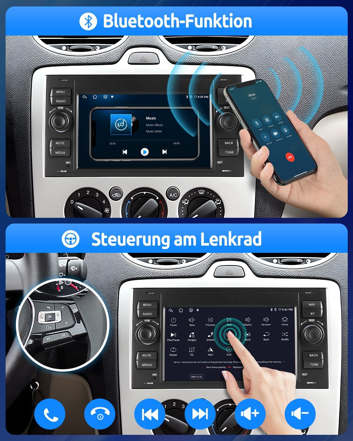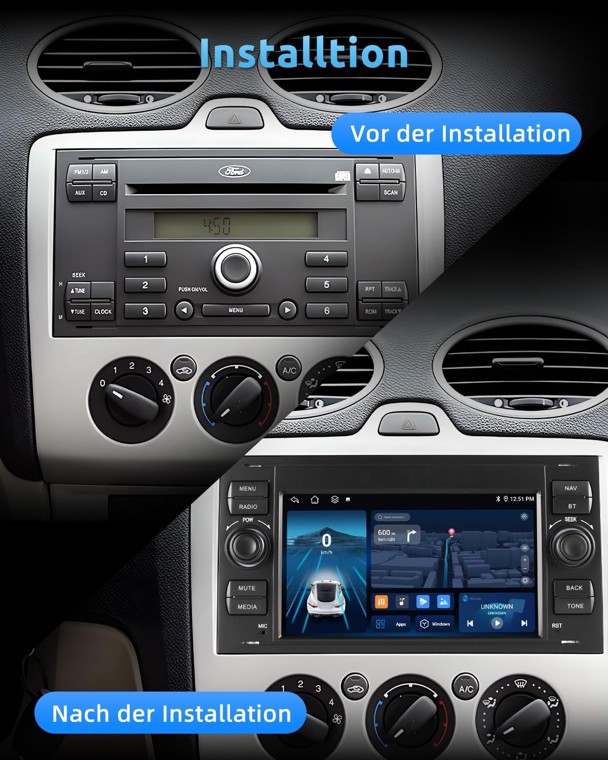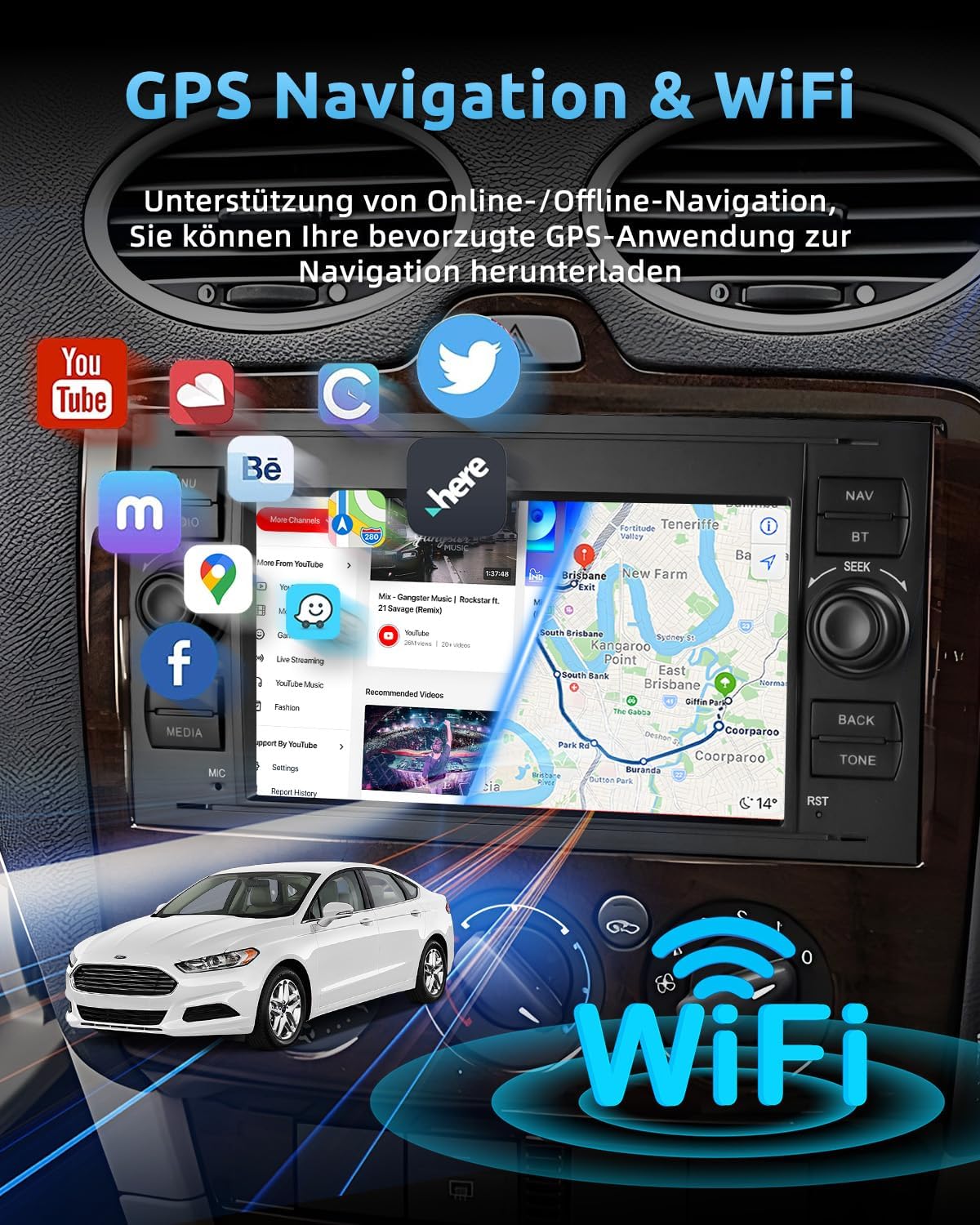 • Съвместимо с Ford HD автомобилно радио: 7-инчов (приблизително 18 см) капацитивен HD сензорен екран с резолюция 1024 x 600, 2 GB RAM и 64 GB ROM, Android 14, позволява изтегляне на приложения и видеоклипове. Plug and play, не е необходима допълнителна рамка или кабел. Оборудвано с Canbus, поддържа оригинални функции като управление от волана за повече удоволствие и комфорт при шофиране.