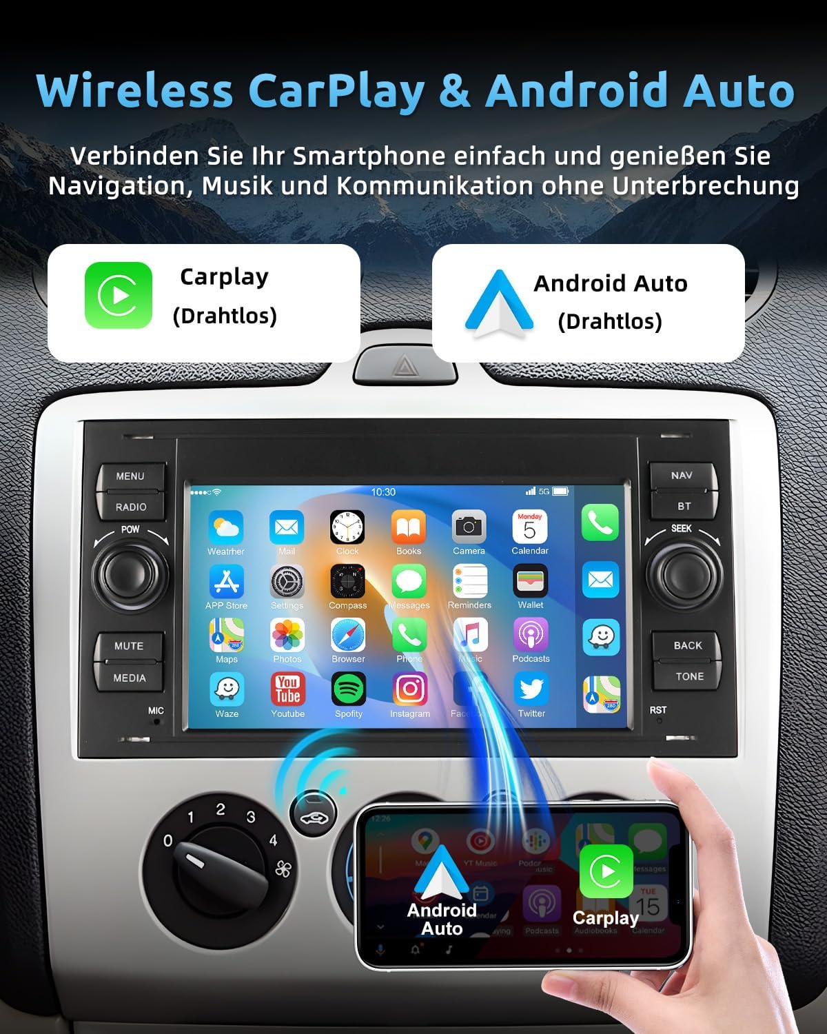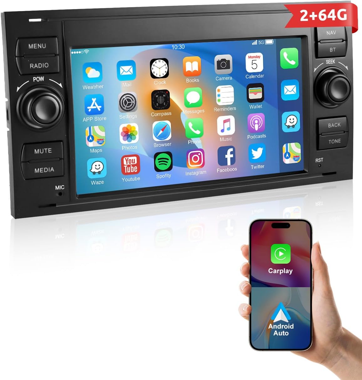 ESSGOO 2+64G безжично автомобилно радио с Android 14 с Carplay и Android за Ford Fiesta Galaxy Transit Connect MK7 Focus Fusion Kuga S/C-Max, 7-инчов сензорен екран с Bluetooth FM USB GPS