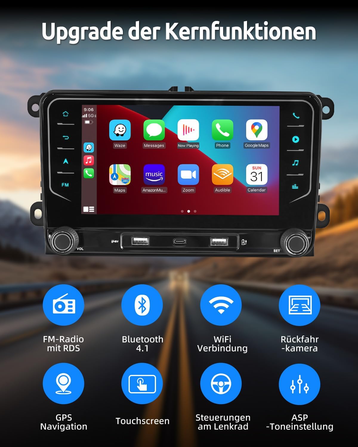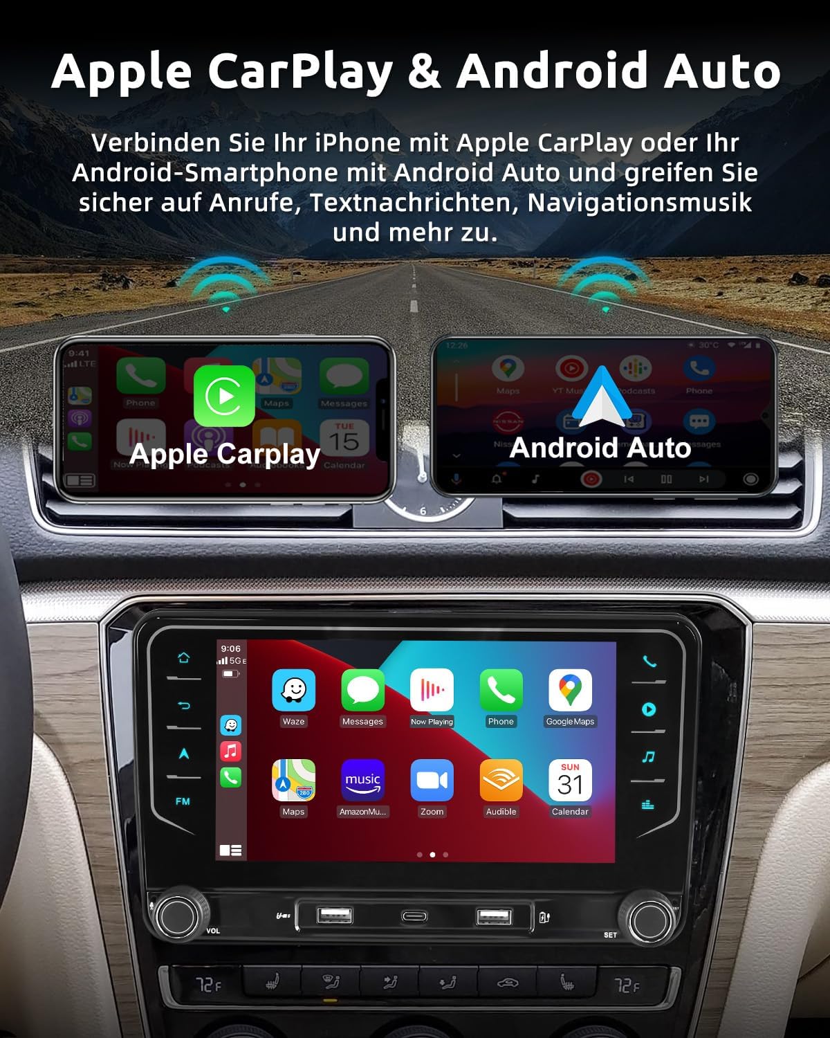• CarPlay und Android Auto:Essgoo Unterstützt CarPlay und Android Auto mit sowohl kabelgebundener als auch kabelloser Verbindung über USB oder Bluetooth. Dadurch können Sie bequem Anrufe entgegennehmen, Textnachrichten senden und empfangen, navigieren sowie Musik hören – und die Fahrsicherheit wird verbessert.