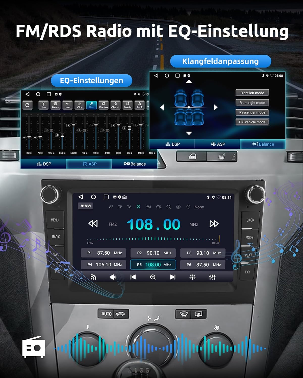RDS/FM-Radio: Integriert einen ASP-Chip, einen 16-Band-EQ und einen 4x45W-Verstärker, um Sender präzise zu finden und 18 häufig verwendete FM-Kanäle mit einem Tastendruck zu speichern. Kein manuelles, häufiges Suchen erforderlich. Schalten Sie es ein, um sofort auf Ihre Lieblingsprogramme zuzugreifen, sodass Verkehrsnachrichten, Nachrichteninformationen und schöne Musik Sie jederzeit begleiten und Sie ununterbrochen zuhören können.
