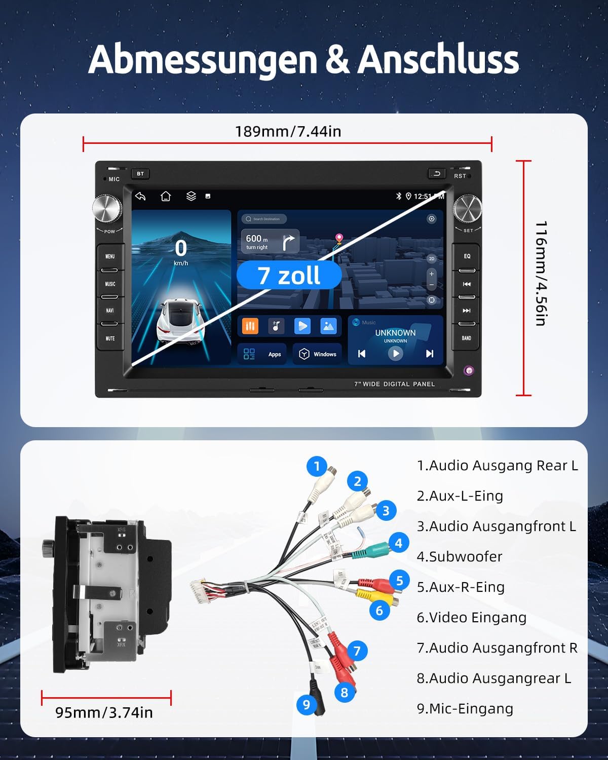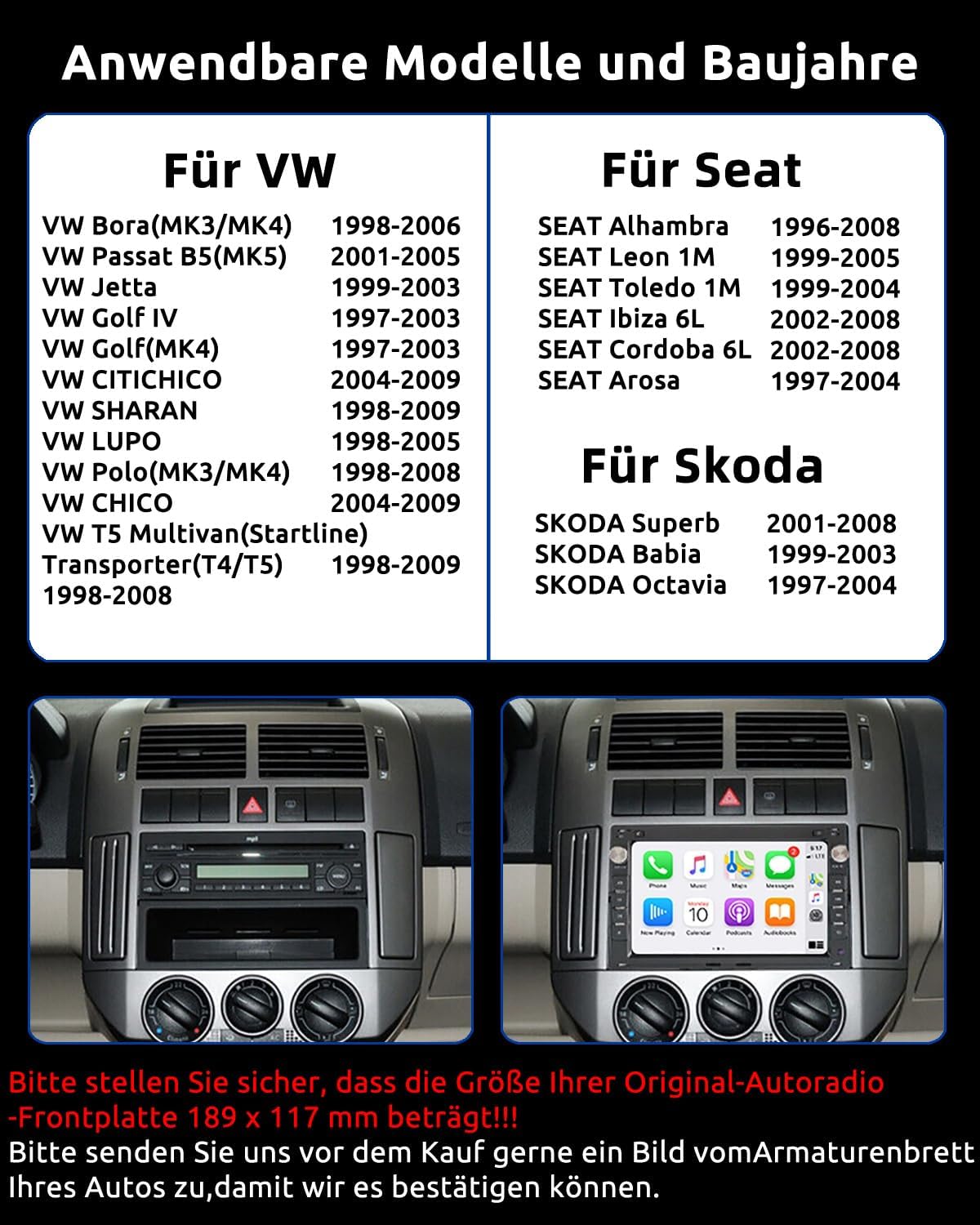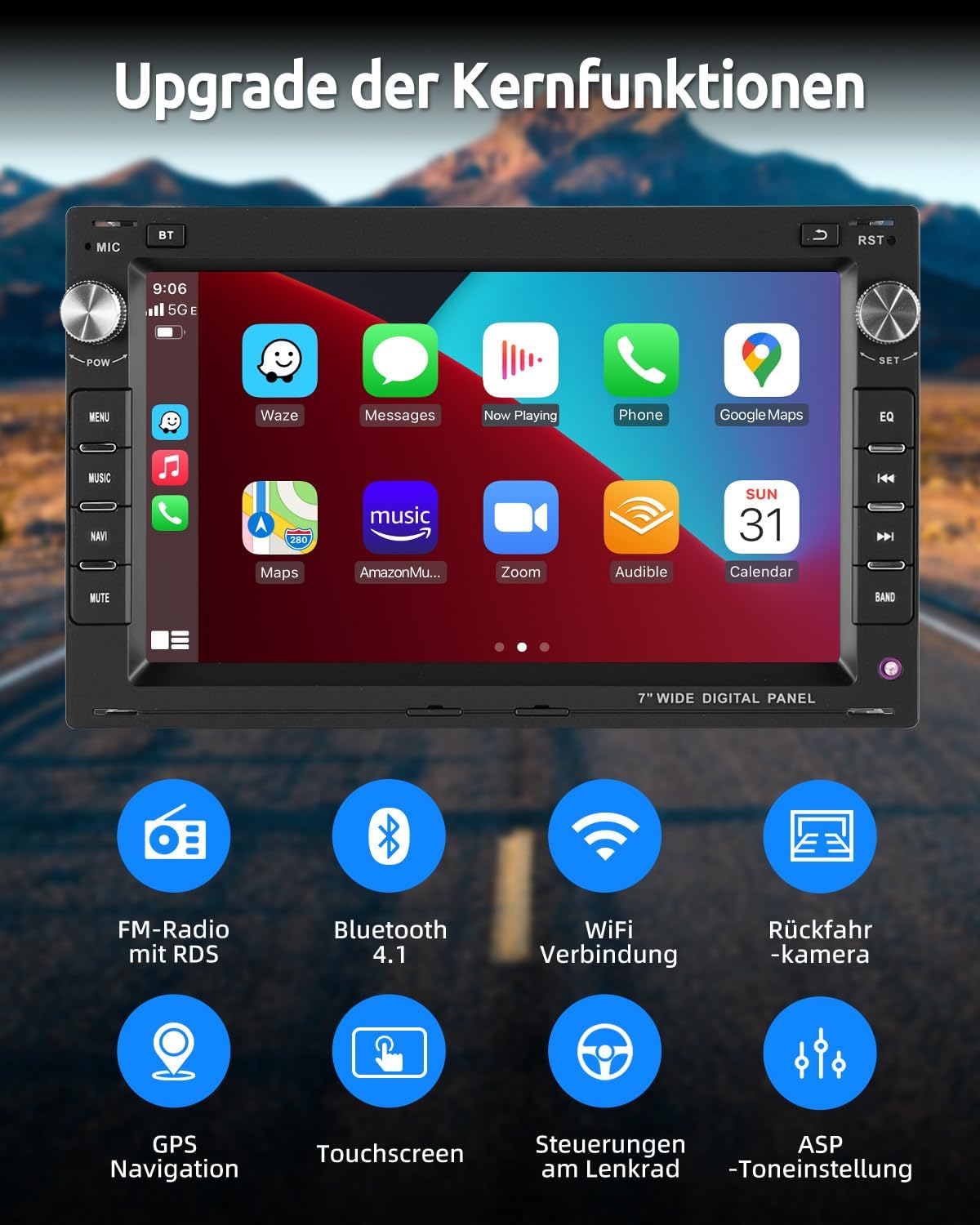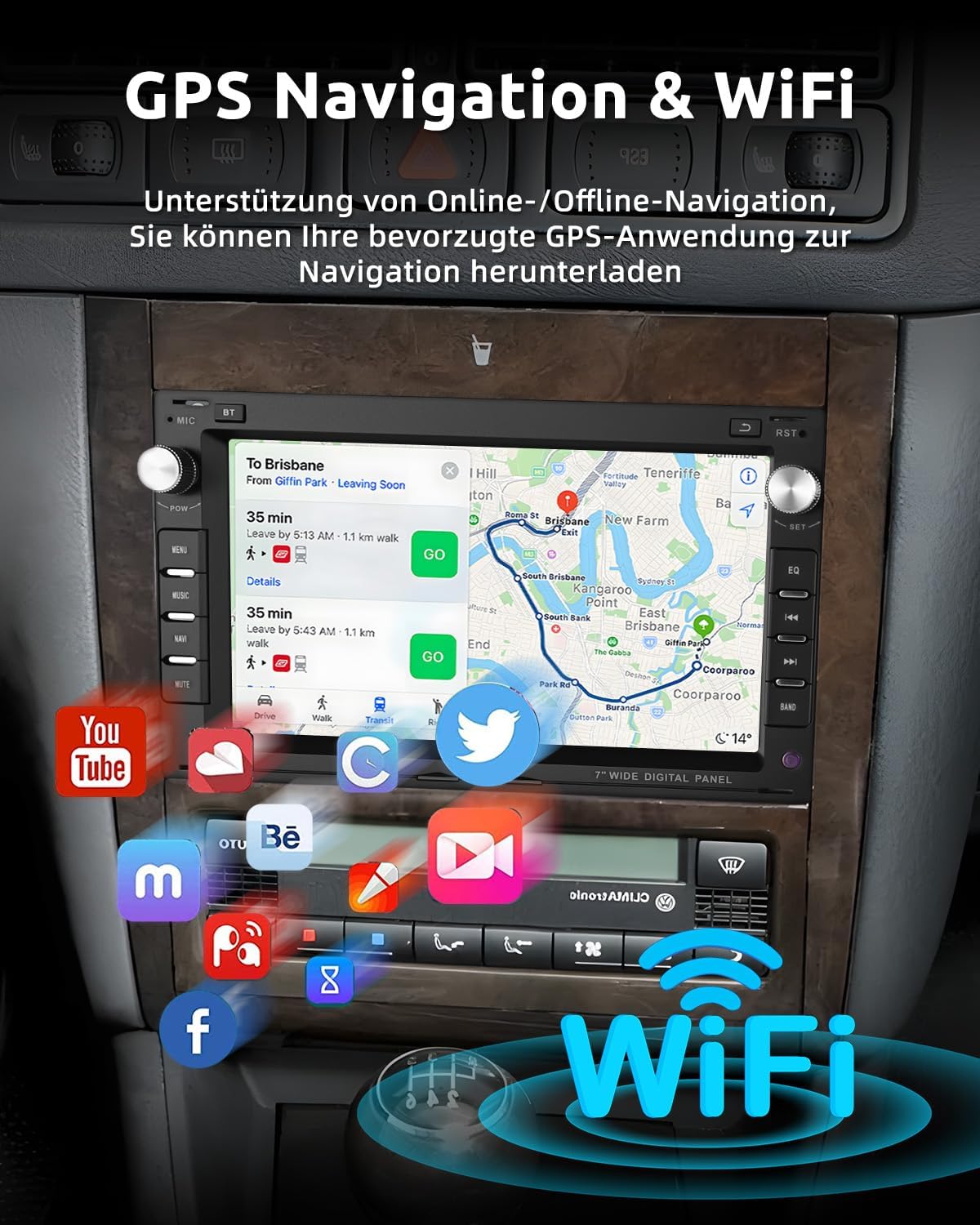 The touch display with mirror link connects iOS/Android mobile phones wirelessly to the car radio, control apps such as navigation or music safely via physical buttons or the precise touch display. iPhone: Easy synchronisation via WiFi, Android: Optional WiFi or original USB cable (not for Samsung, Huawei).