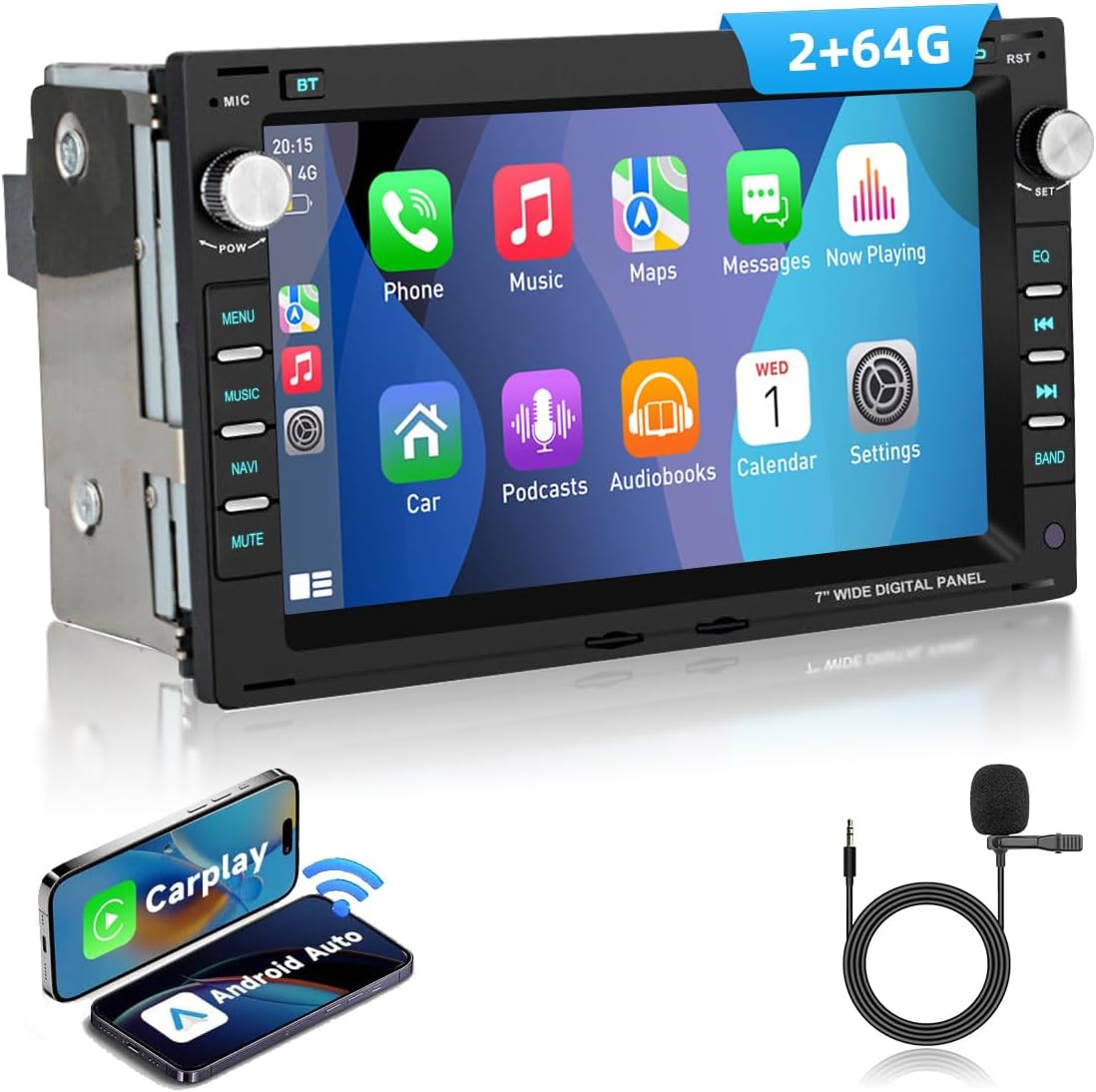 Car radio configuration: 2GB RAM + 64GB ROM, 7-inch HD IPS touchscreen, Android 14 system, plug and play. Intelligent interaction: Wireless CarPlay, Android car, voice control and screen mirror. (Screen mirror not compatible with Samsung and Huawei) Safe driving: GPS navigation, rear view camera function (camera B0DX28355J must be purchased separately), steering wheel control. Multimedia: Bluetooth 4.1 hands-free system, RDS with memory for 18 FM transmitters, 32-band EQ, 4 x 45 W amplifiers. CANBUS: Real-time synchronisation of vehicle data, intelligent precision. DAB+: High quality radio experience. (DAB tuner B0DX2CQZ3G must be purchased separately)