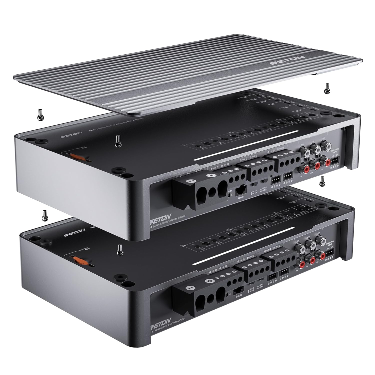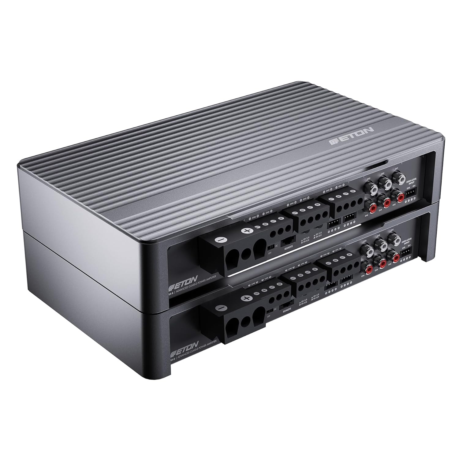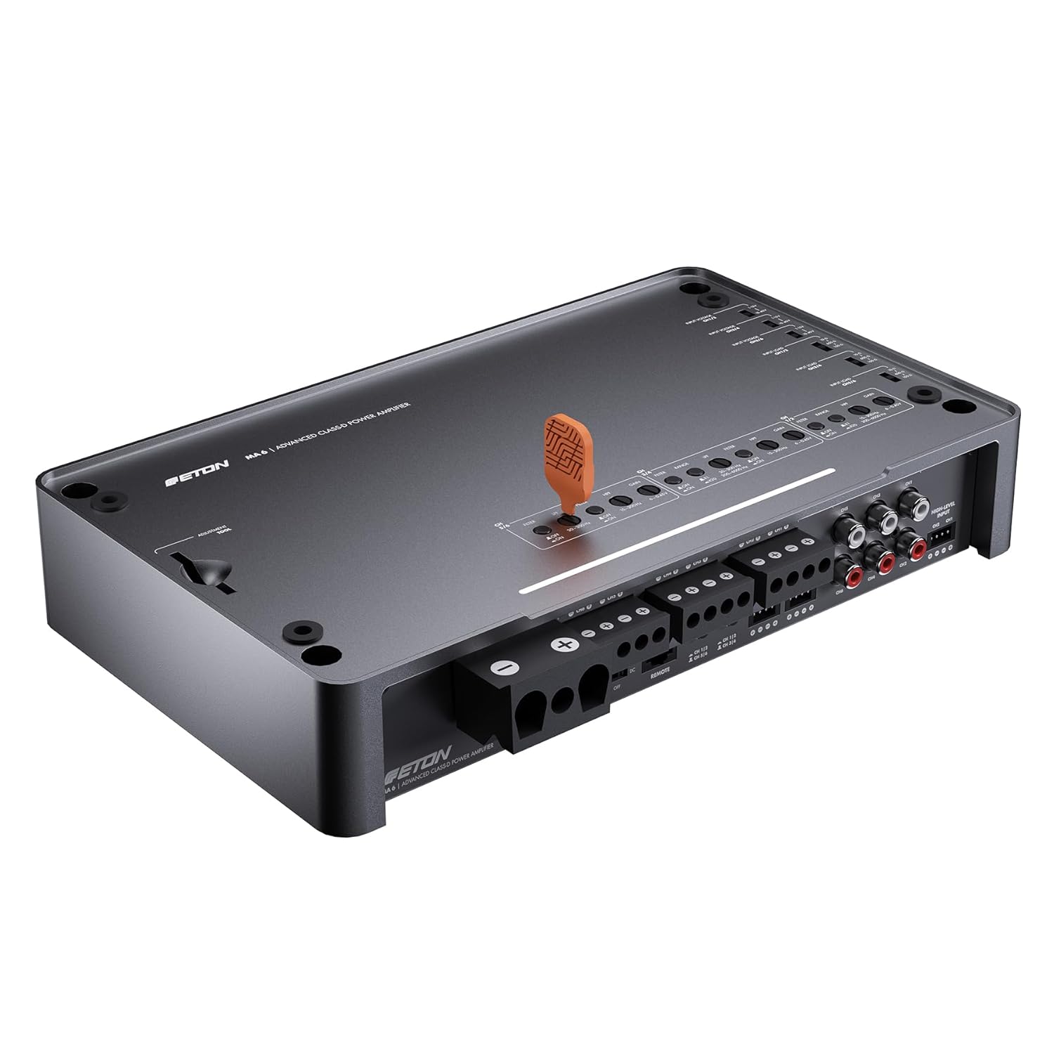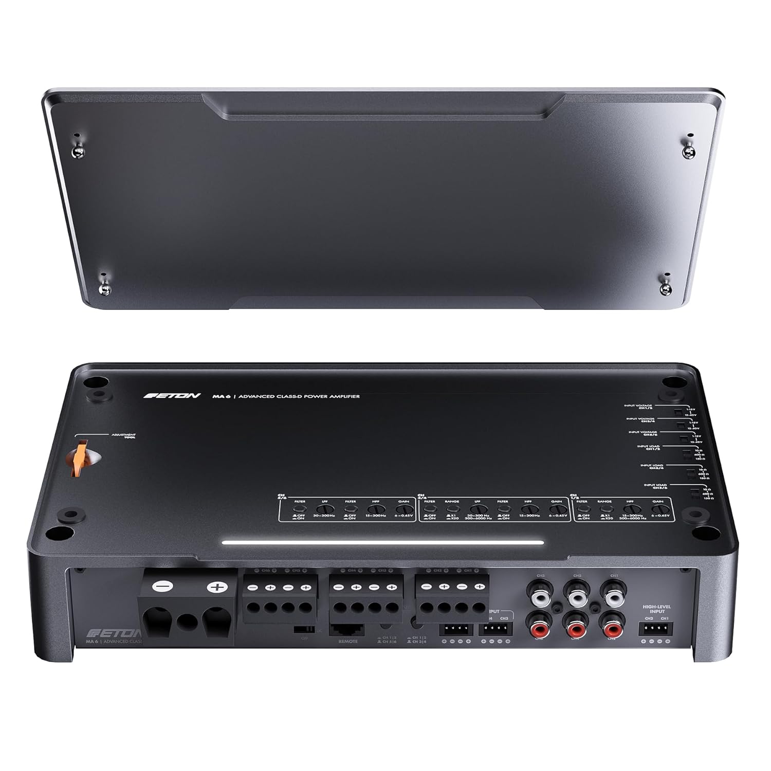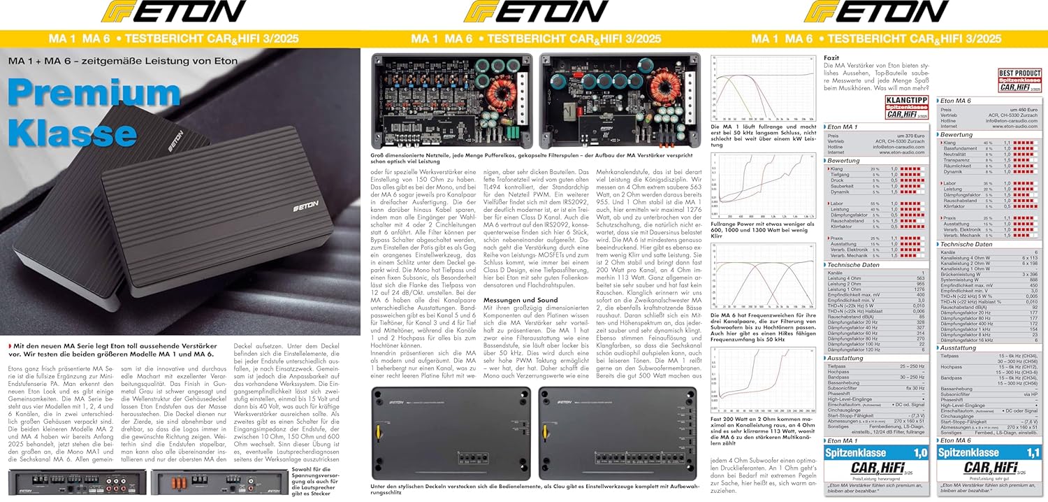 • MA 6 предлага първокласна електроника в красиво проектиран, еднокомпонентен корпус от лят алуминий с матово, анодизирано метално покритие. Горната плоча, с логото на ETON, е подвижна и може да се завърта на 180° за гъвкав монтаж и оптимална визуална интеграция. Под горната плоча се намират множество контроли: 12 dB/октава високочестотни и нискочестотни филтри, настройки на входното напрежение на високо ниво и входното съпротивление на високо ниво (входно натоварване), както и усилване.