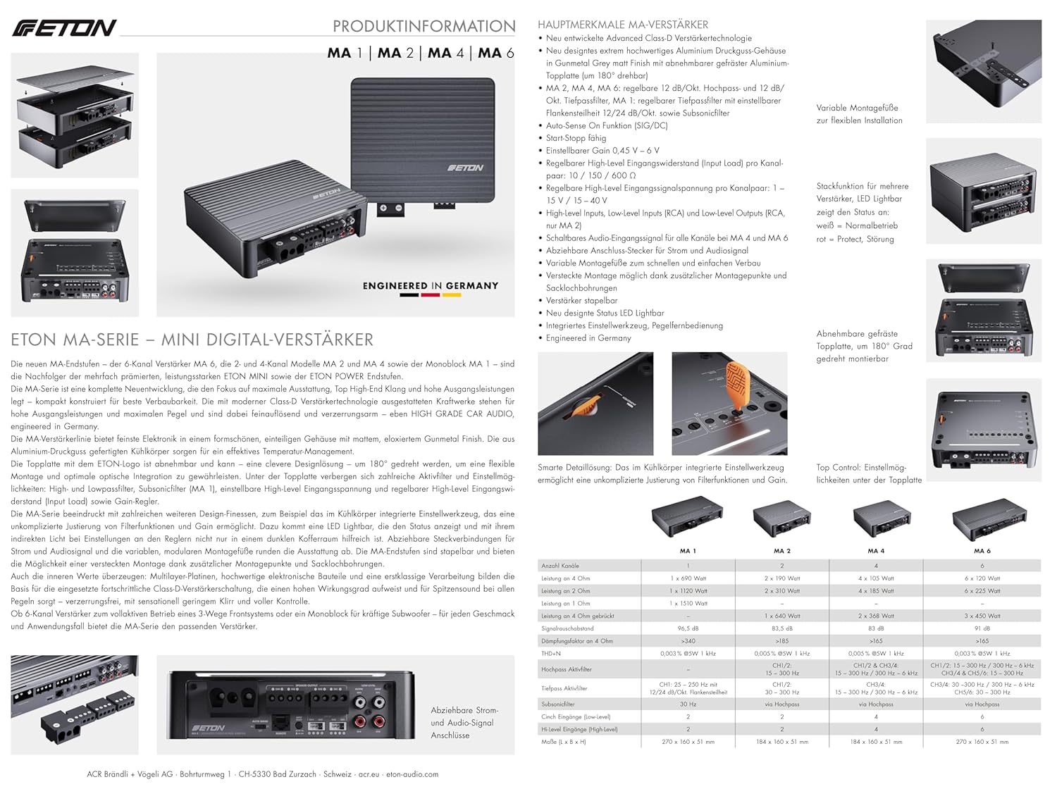 • Новите усилватели MA са наследници на многократно награждаваните, високопроизводителни серии усилватели MINI и POWER. 6-каналният модел MA 6 е изцяло нова разработка, фокусирана върху максимални характеристики, първокласен звук от висок клас и висока изходна мощност – ВИСОКОКАЧЕСТВЕНО АВТОМОБИЛНО АУДИО, проектирано в много компактна форма за оптимален монтаж.