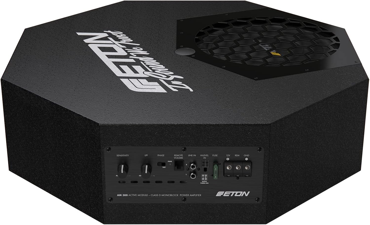 Един от най-мощните активни субуфери за резервно колело в своя клас! Корпус от масивна MDF дървесина със специално разработено покритие, здрав изцяло. Захранван от активен усилвателен модул ETON AM300 с 300 вата RMS и мощен 25 см субуфер, истински мощен говорител с тънки размери и напълно скрит монтаж. Включени са високочестотни входове, дистанционно управление на нивото на звука, функция за автоматично разпознаване, съвместимост със старт/стоп и монтажни аксесоари. Проектиран в Германия.