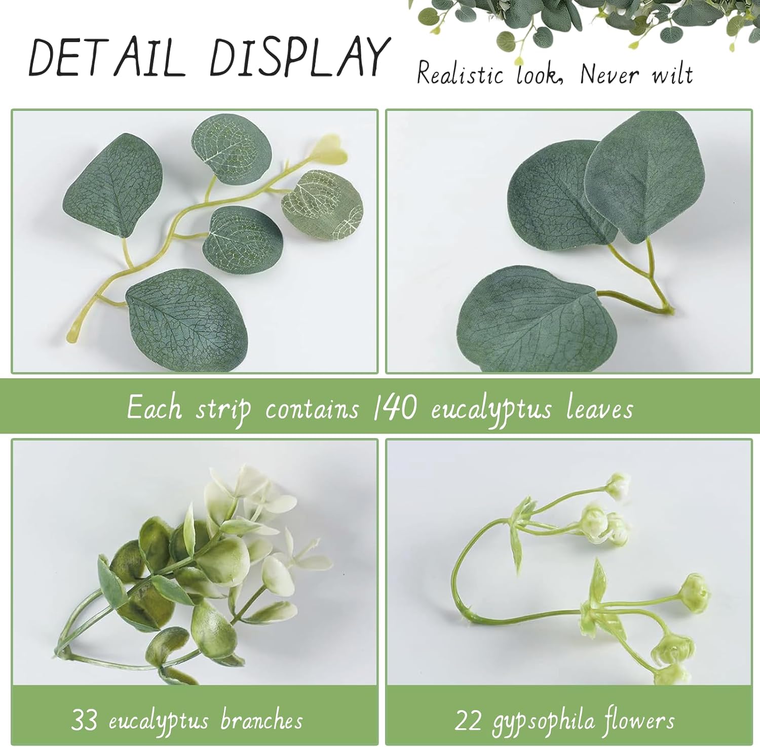 Всеки реалистичен евкалипт гирлянд е снабден с практични халки за закрепване, така че е лесен за закрепване. Няколко евкалиптови гирлянди се завързват заедно, за да създадат особено пищен вид. Чудесни са и за „Направи си сам“ венци.