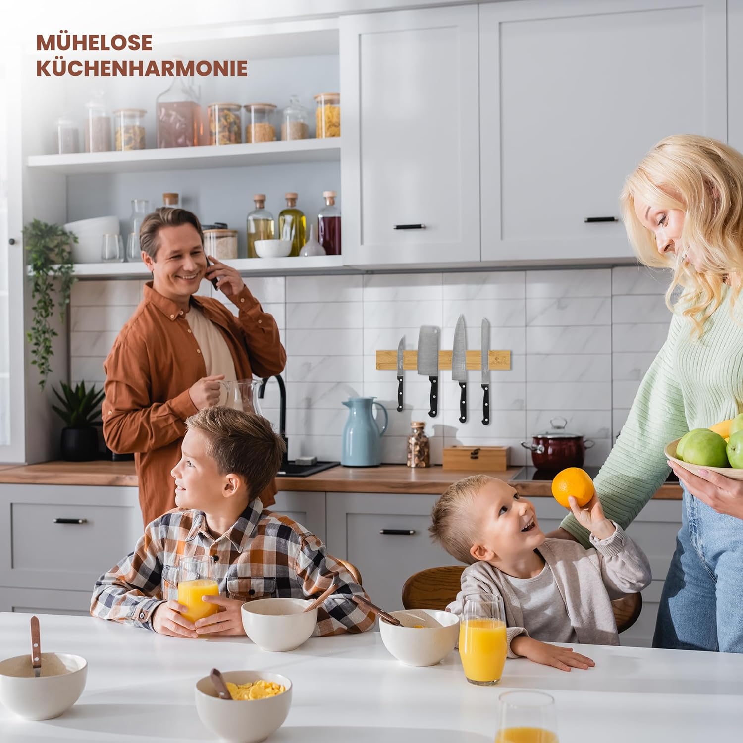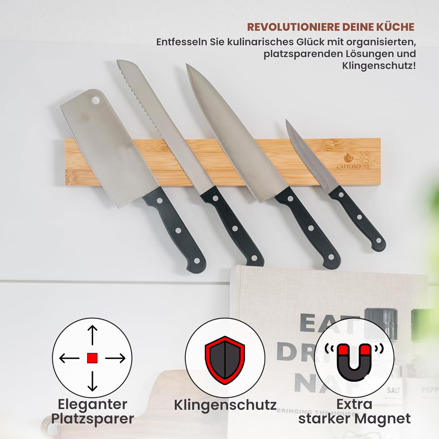 Exitoso® Магнитна лента за ножове, самозалепваща се 40 см - Релса за ножове без пробиване с 3M лепяща лента - Захващане, устойчиво на бомби - Магнитен държач за ножове, магнитна поставка за ножове - Бамбук