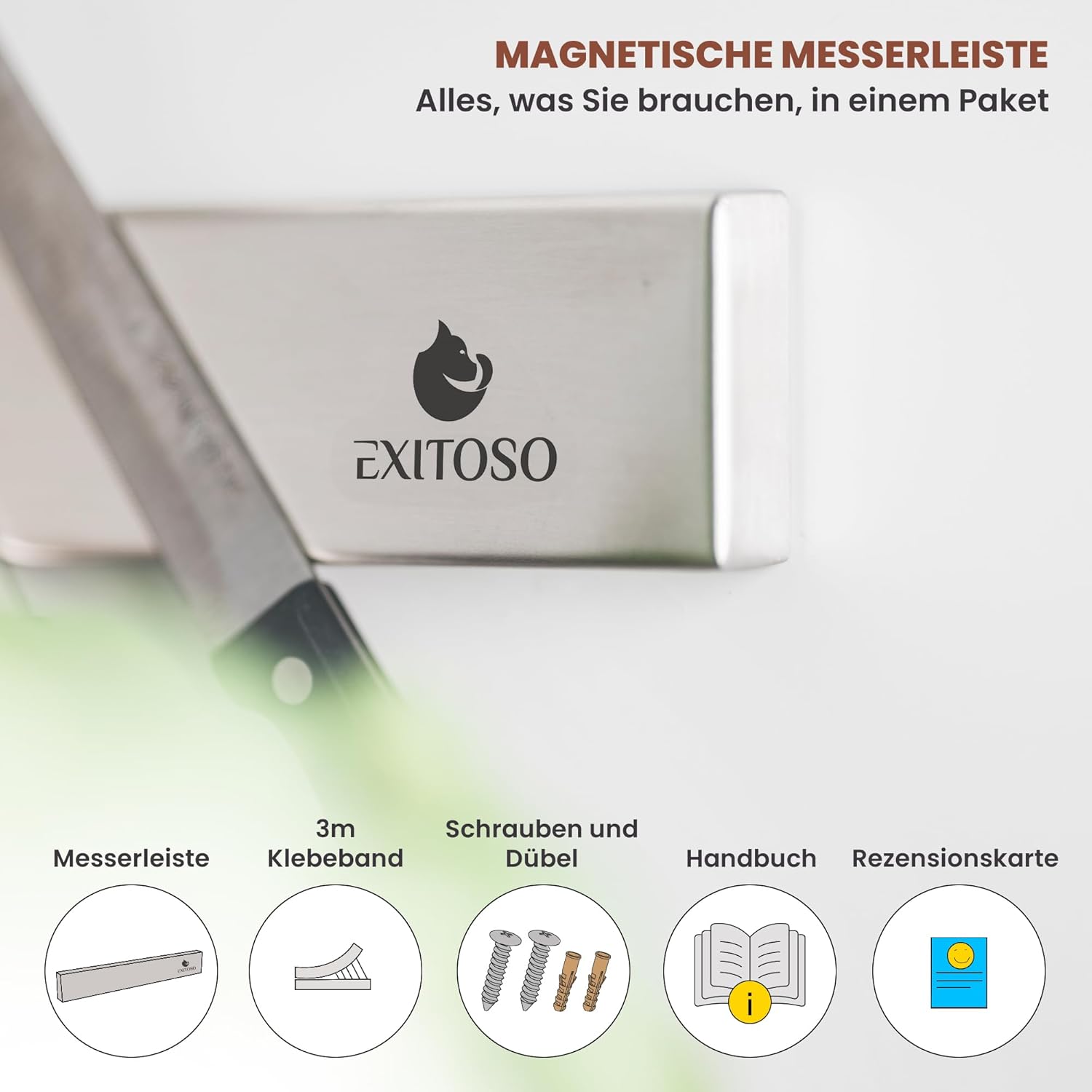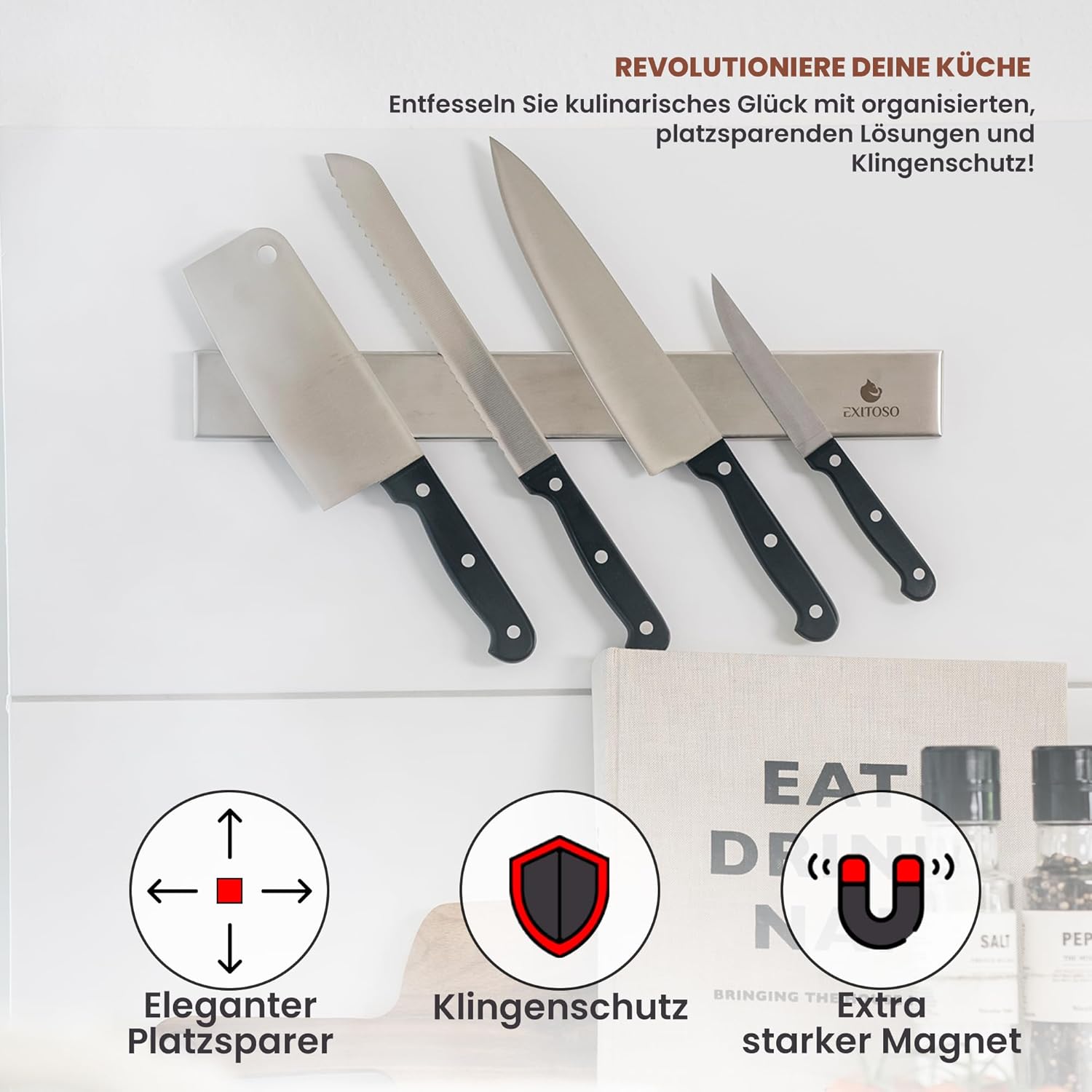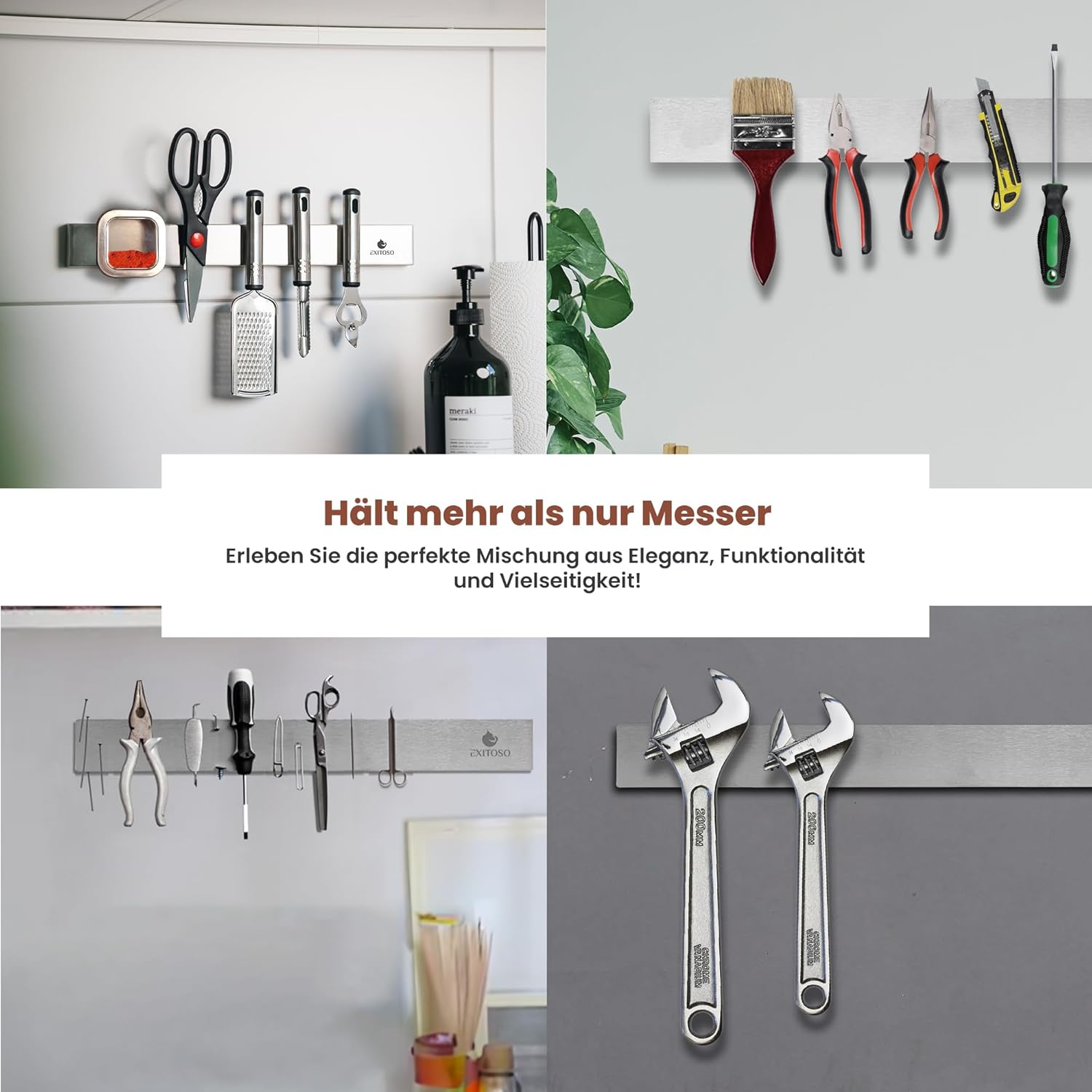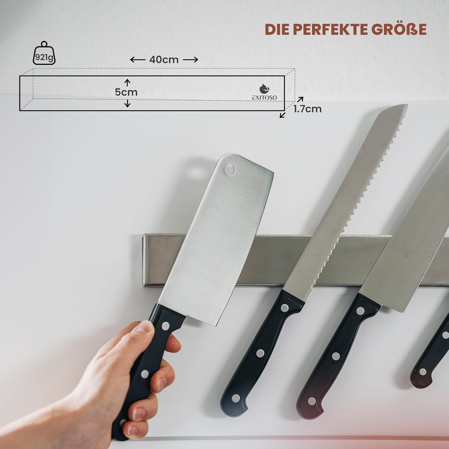 Exitoso® Оригиналната магнитна лента за ножове I Без пробиване – Самозалепваща се с 3M лепяща лента, Поставка за кухненски ножове за стенен монтаж, Държач за ножове от неръждаема стомана, 40 см – Удобно съхранение на ножове