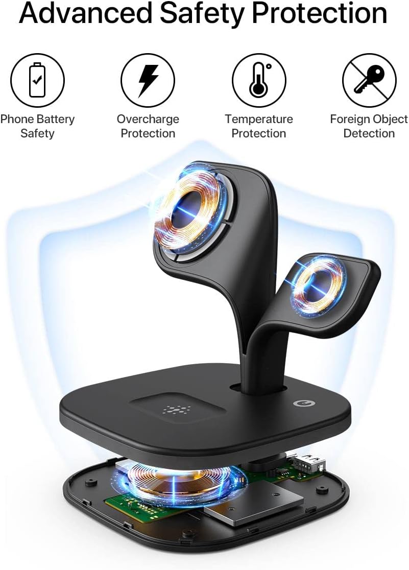 • Интелигентно Mag-safe зареждане: интегриран високопроизводителен чип с множество защитни системи надеждно предпазва вашите устройства от презареждане, пренапрежение, свръхток, прегряване и късо съединение. Насладете се на безопасно, напълно безшумно зареждане - идеално за нощно време и чувствителни среди за сън. Зарядната станция за iPhone осигурява безпроблемно зареждане.