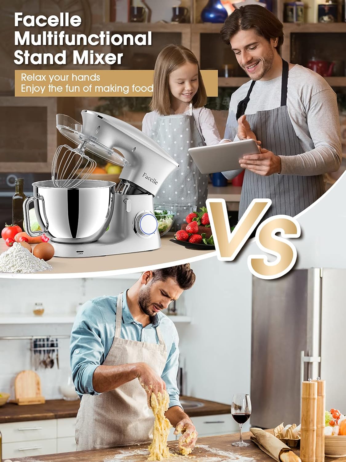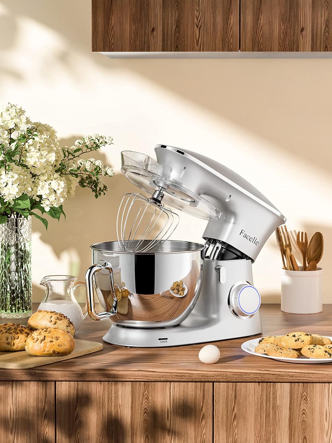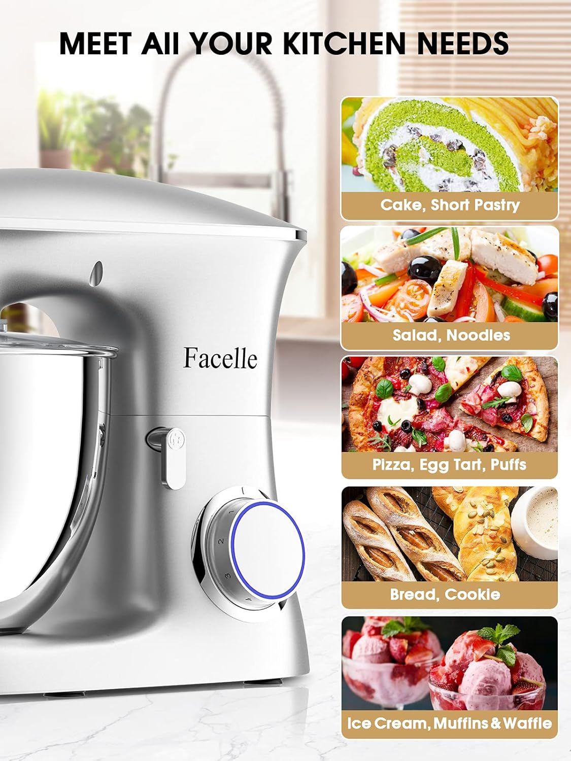 • Мощен 2000 W мотор: електрическият кухненски миксер от Facelle има висококачествен ръчен мотор с консумация на енергия от 2000 W, дълъг експлоатационен живот и висока производителност, за да отговори на повечето от вашите изисквания за кухненски миксер (работен шум <75 dB)
