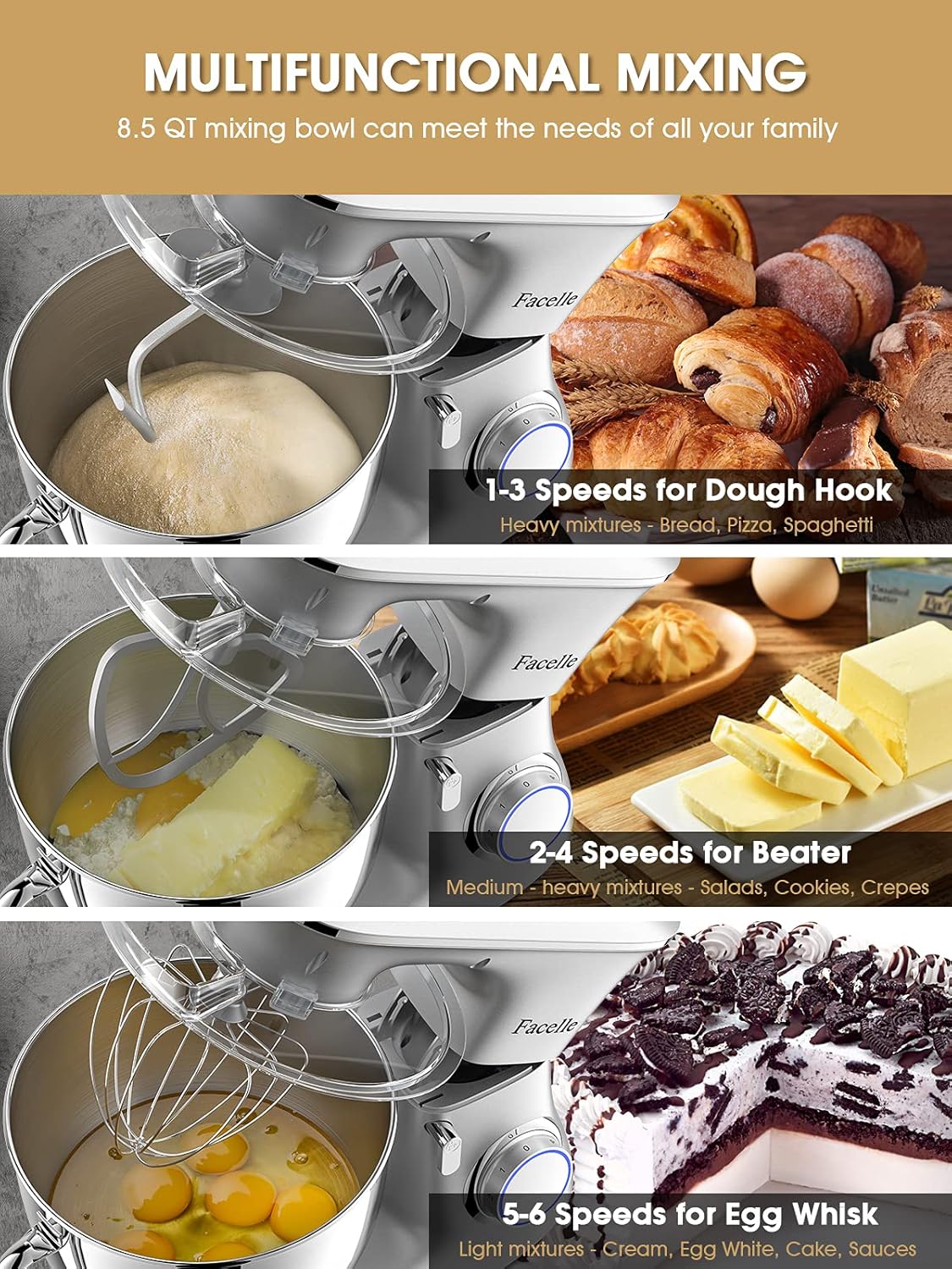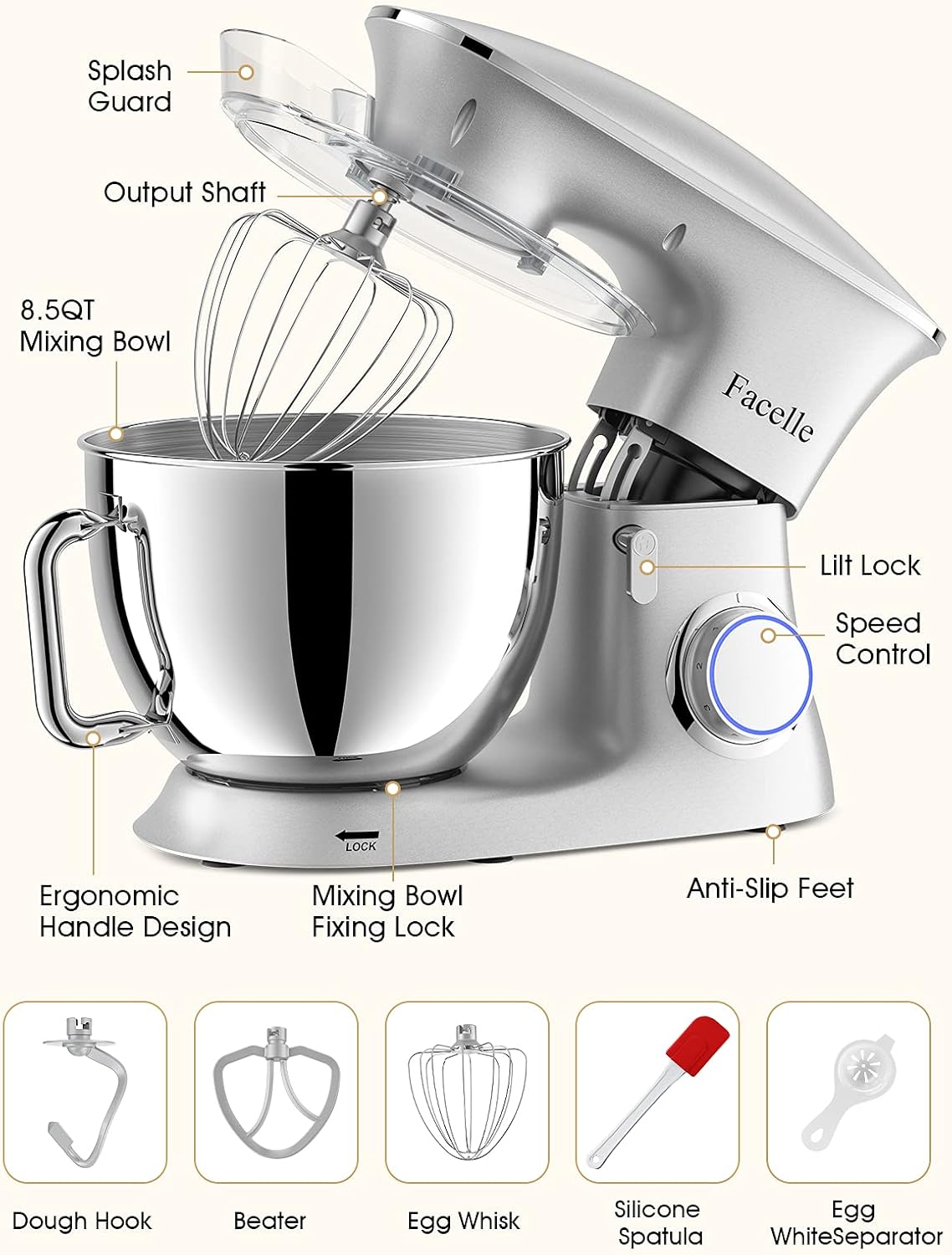 Facelle Кухненски робот, машина за месене 2000 W 8.5 L, машина за месене на тесто, машина за смесване с бъркалка, кука за тесто, бъркалка и предпазител от пръски за печене, торти, бисквити, месене, 6+ скорости