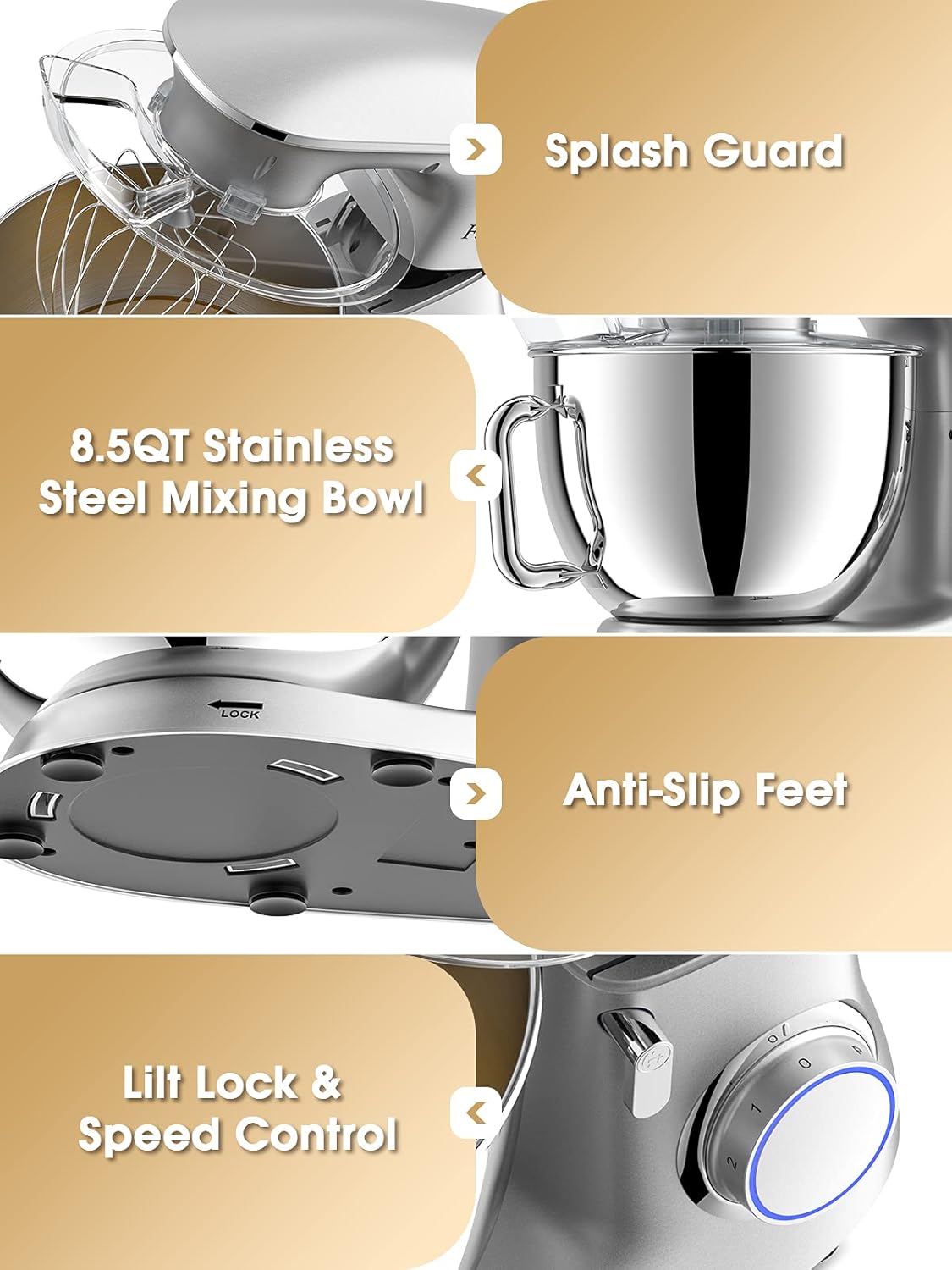 • Купа 8,5 л: Тази купа за смесване е изработена от вносна неръждаема стомана 304, което гарантира безопасността на храните, а капацитетът ѝ от 8,5 л може да задоволи нуждите на повечето семейства от 7-10 души. Подходящ подвижен предпазител против пръски с голям отвор за подаване помага за добавяне на съставки без да се цапа, което ви позволява да готвите и приготвяте домашни ястия с голяма лекота.