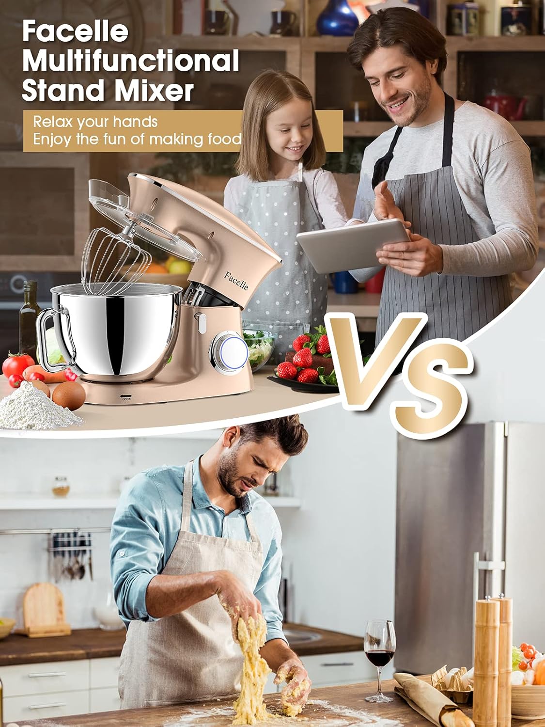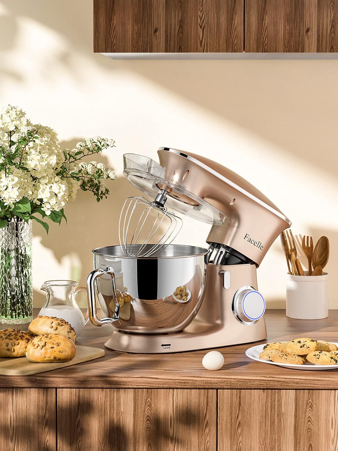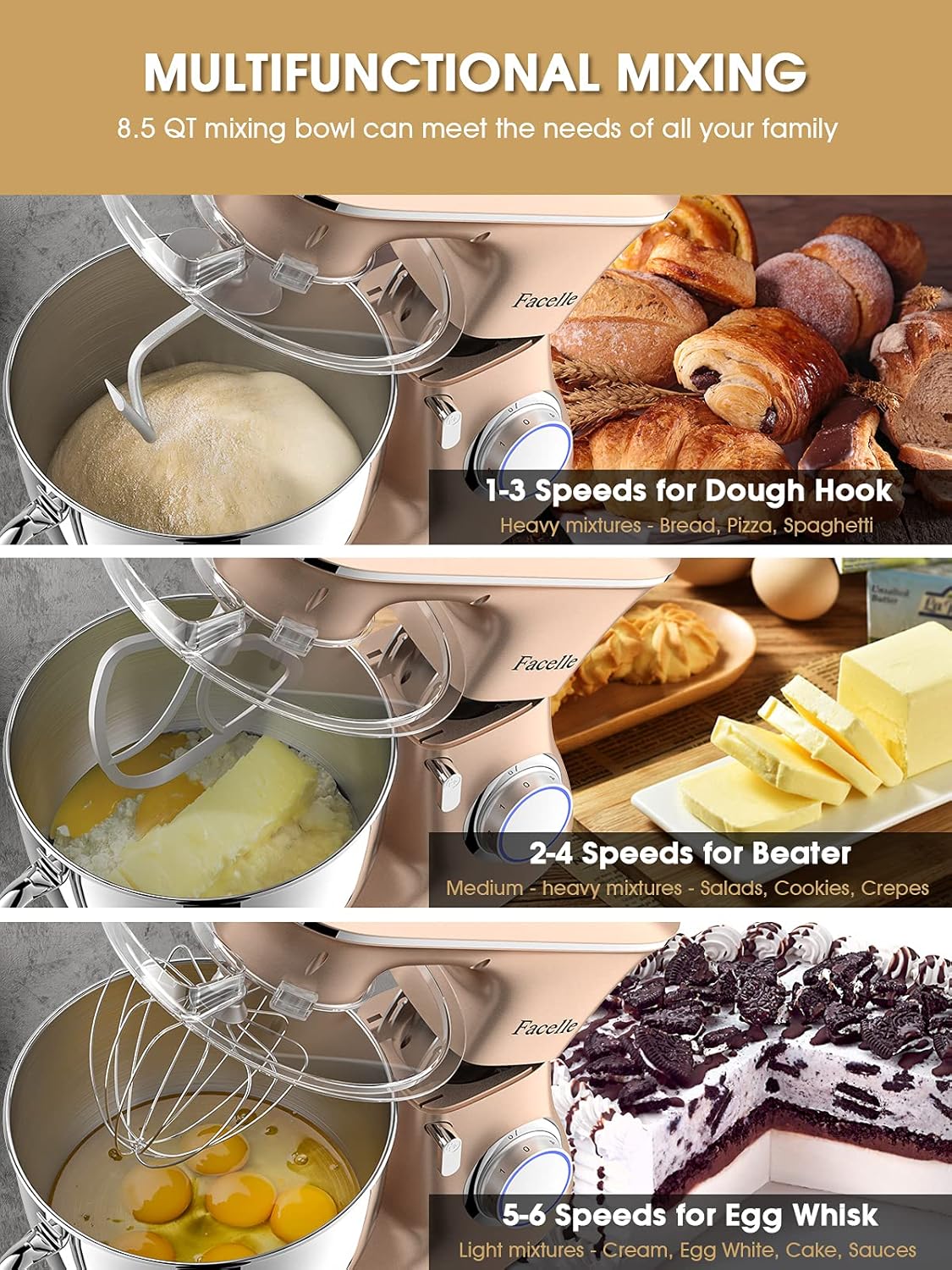 • Мощен 2000 W мотор: електрическият кухненски миксер от Facelle има висококачествен ръчен мотор с консумация на енергия от 2000 W, дълъг експлоатационен живот и висока производителност, за да отговори на повечето от вашите изисквания за кухненски миксер (работен шум <75 dB)