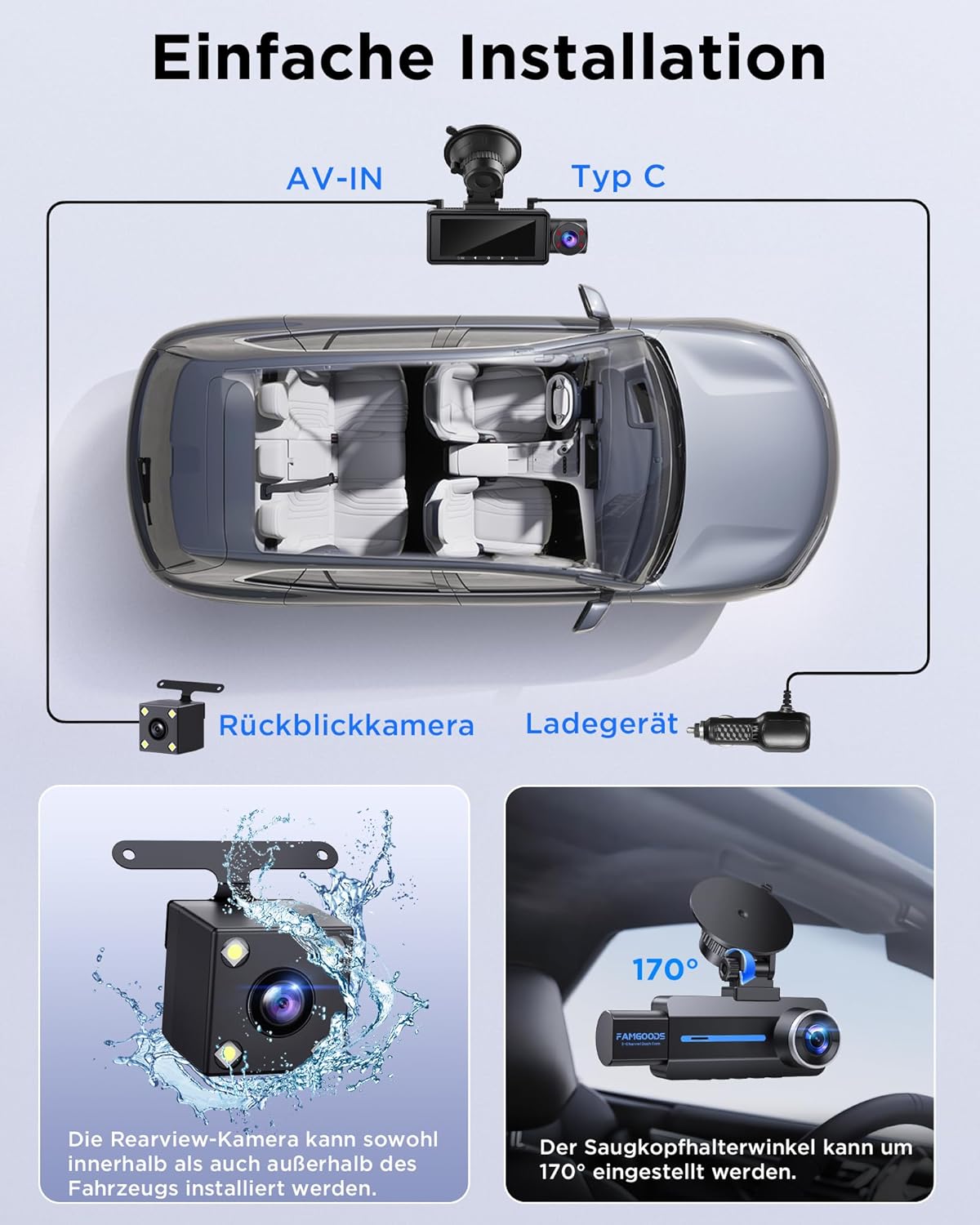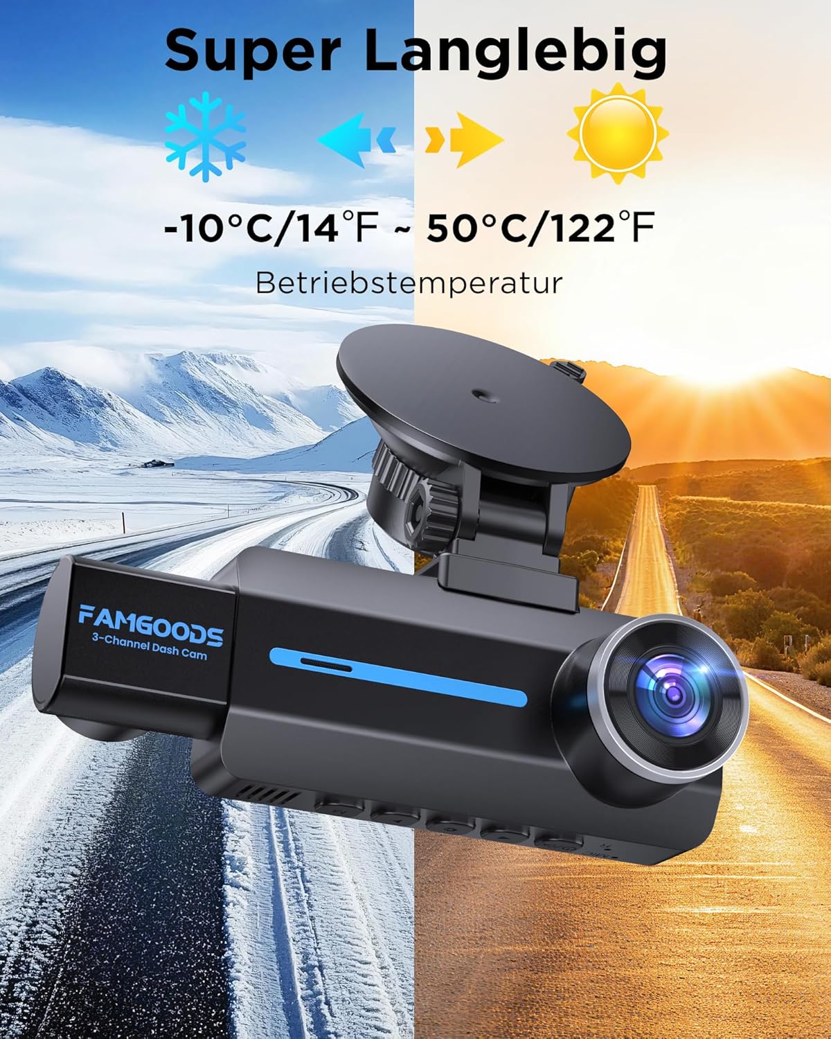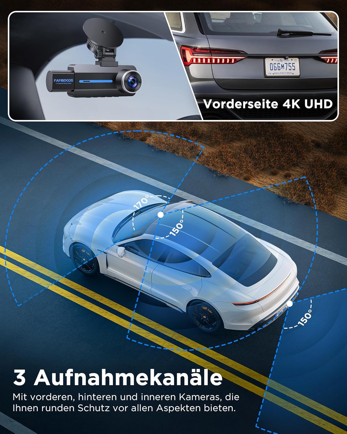 • 【Ultra 4K и 3 канала】Автомобилната камера Famgoods записва в 4K HD, предоставяйки кристално ясни детайли за надеждни доказателства и подобрена безопасност на пътя. Триканалната ѝ система включва 170° ултраширокоъгълна предна камера и 150° интериорна и задна камери. Това позволява едновременно записване от всички ъгли, осигурявайки пълно покритие на околността и минимални слепи зони. Вграденият 3,16-инчов дисплей поддържа изглед на разделен екран, така че можете да видите и трите перспективи с един поглед.