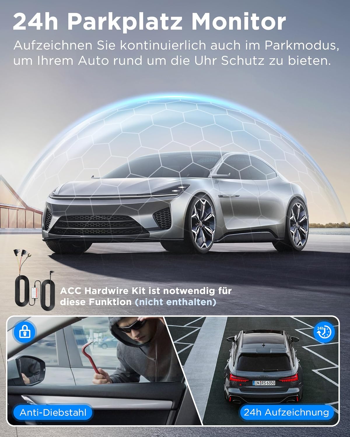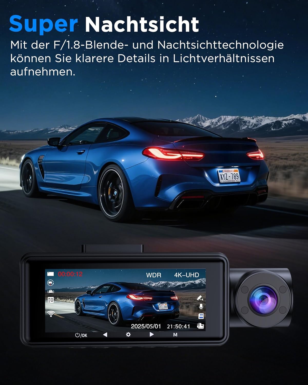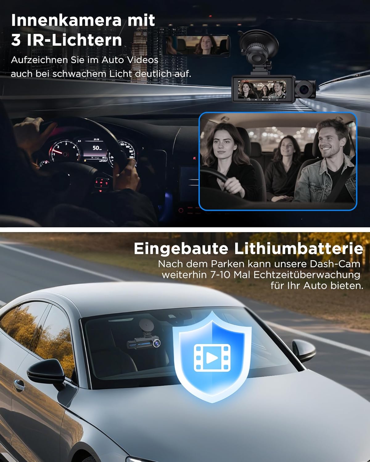 • 【Авторегистратор с усъвършенствано нощно виждане】Оборудван с високочувствителен сензор, ярък обектив с 6 лещи (F1.8) и WDR технология, този видеорегистратор осигурява ясни и стабилни записи дори при условия на слаба светлина, като по този начин повишава сигурността през нощта. Вътрешната камера разполага и с 3 високоинтензивни инфрачервени светодиода, което позволява ясни записи на закрито дори при слаба светлина – за надеждно нощно наблюдение и сигурност.
